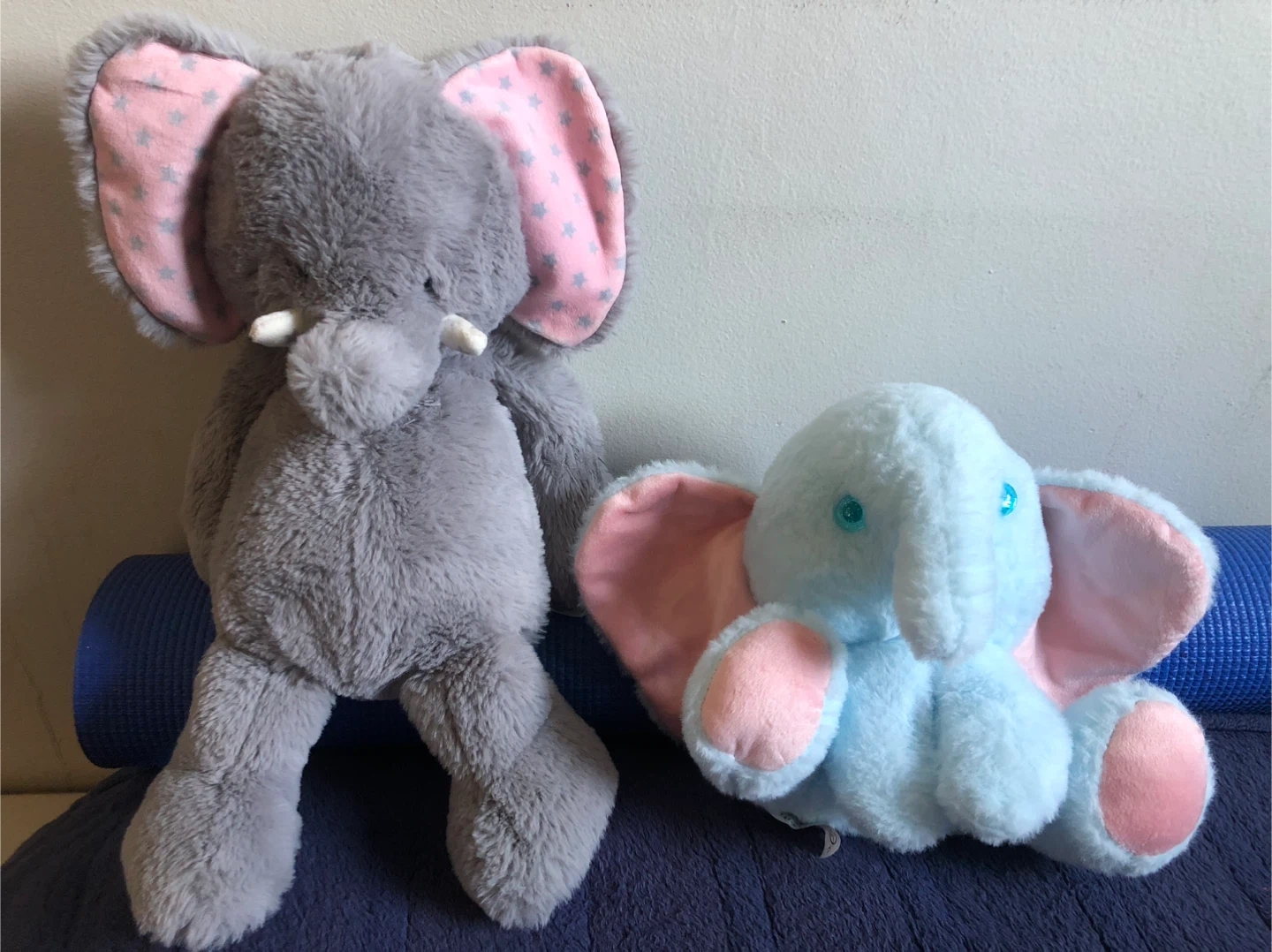 Selling two adorable elephant plush toys! One is grey with pink star-patterned ears, and the other is a light blue colour with pink accents. They're both in good condition and ready for a new home!