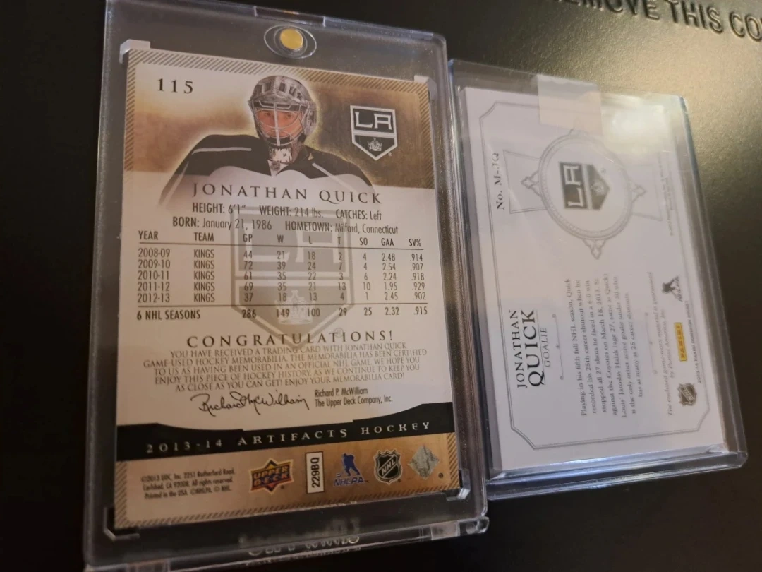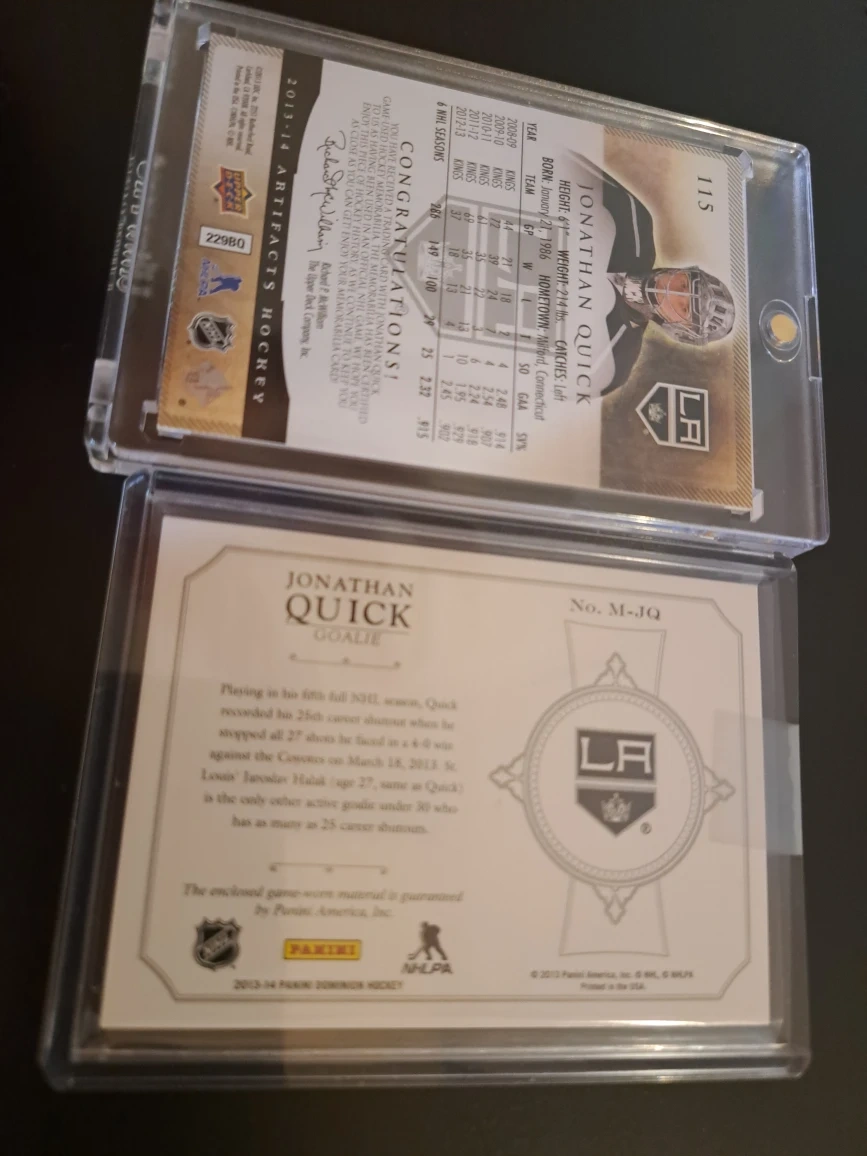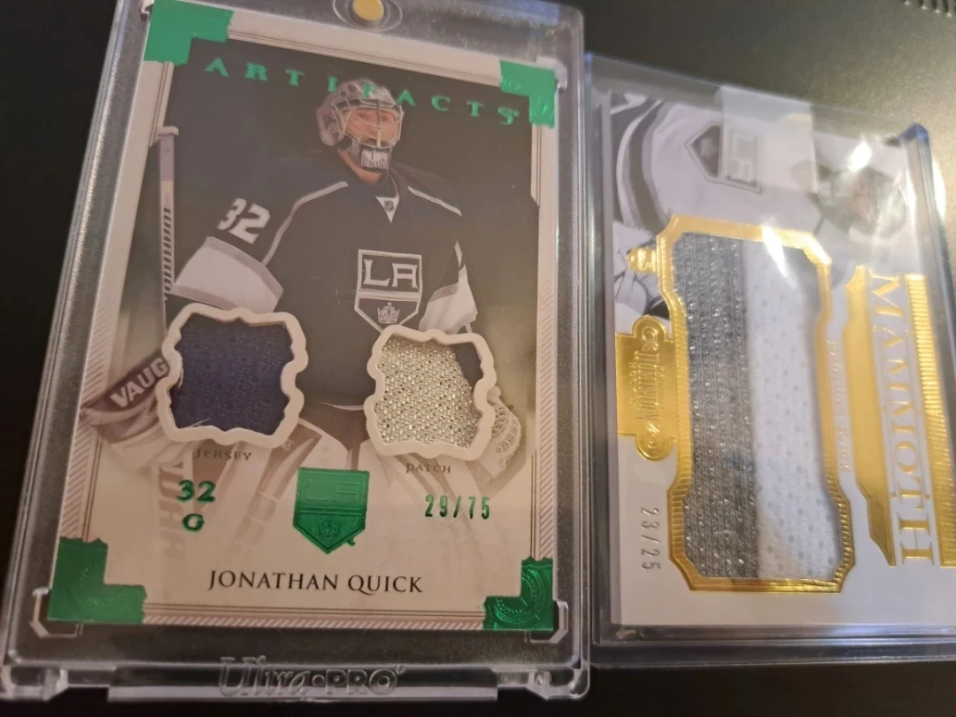Selling two Jonathan Quick hockey cards. One is an Artifacts card, and the other is a Mammoth card. Both are in protective cases! Don't forget I can ship these cards anywhere in Canada for an extra $10 with tracking. Enjoy! Oh and combine as many cards as you want no extra charge for shipping.