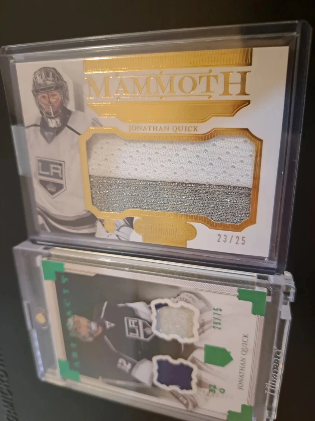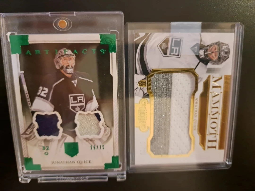 Selling two Jonathan Quick hockey cards. One is an Artifacts card, and the other is a Mammoth card. Both are in protective cases! Don't forget I can ship these cards anywhere in Canada for an extra $10 with tracking. Enjoy! Oh and combine as many cards as you want no extra charge for shipping.