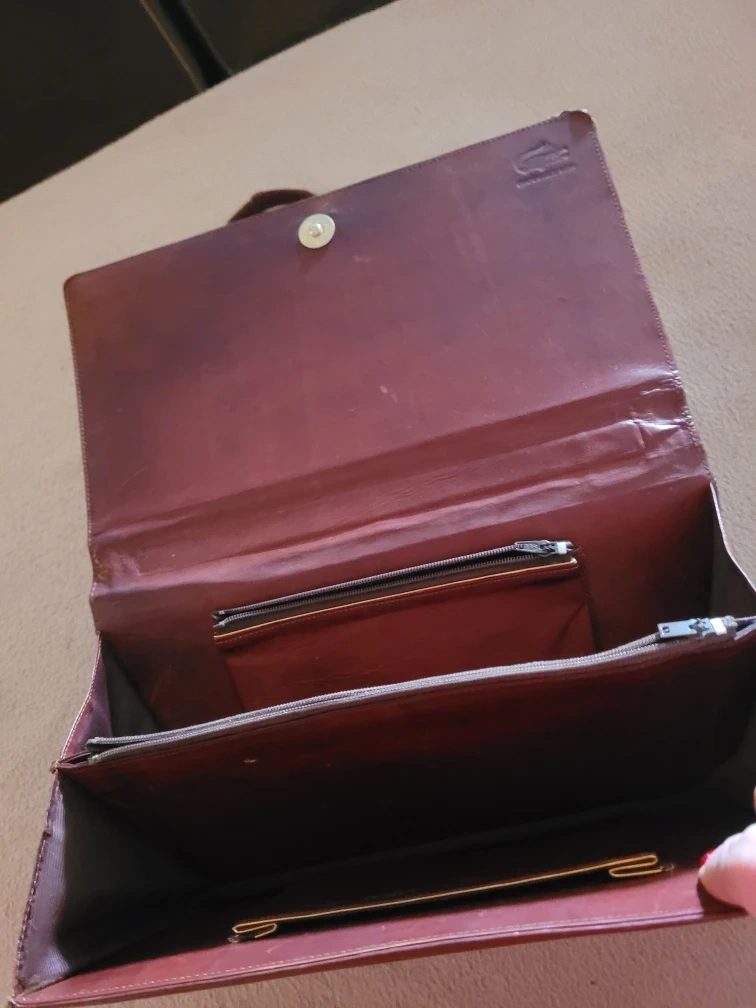 Selling a vintage alligator leather handbag. It's brown with a unique alligator skin pattern. The interior is a deep red colour with multiple compartments. A stylish and timeless piece!