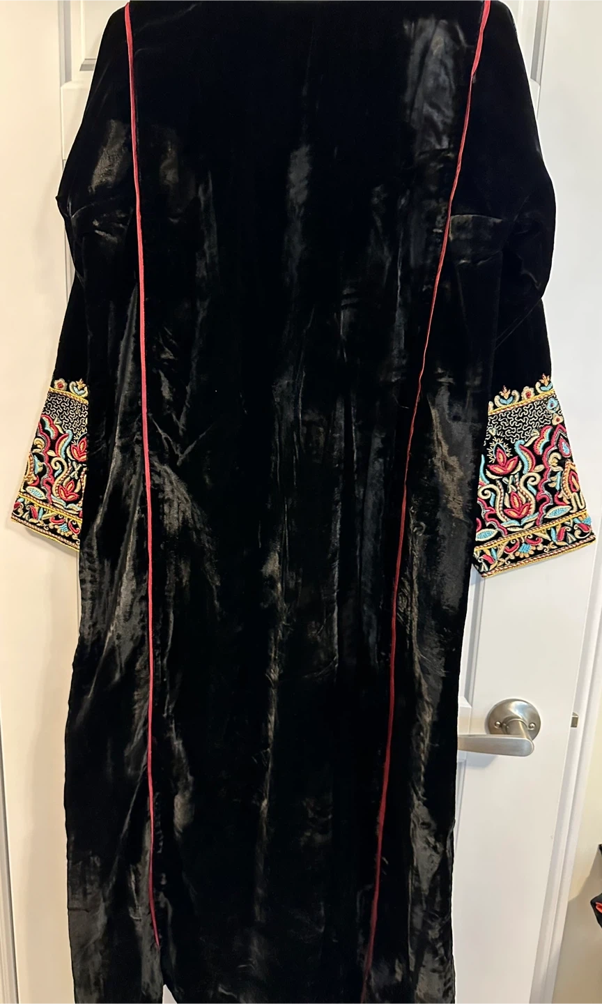 Beautiful black velvet dress with hand and machine embroidery and it is fully lined. The dress features detailed embroidery on the sleeves and neckline, adding a touch of elegance. Chest 42” and length 51”. Not opened on the sides.