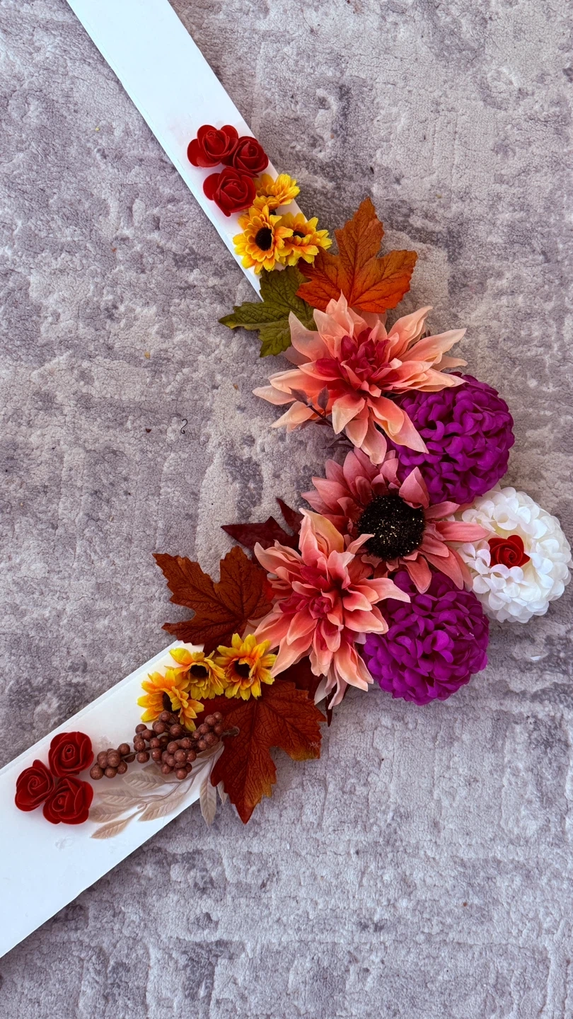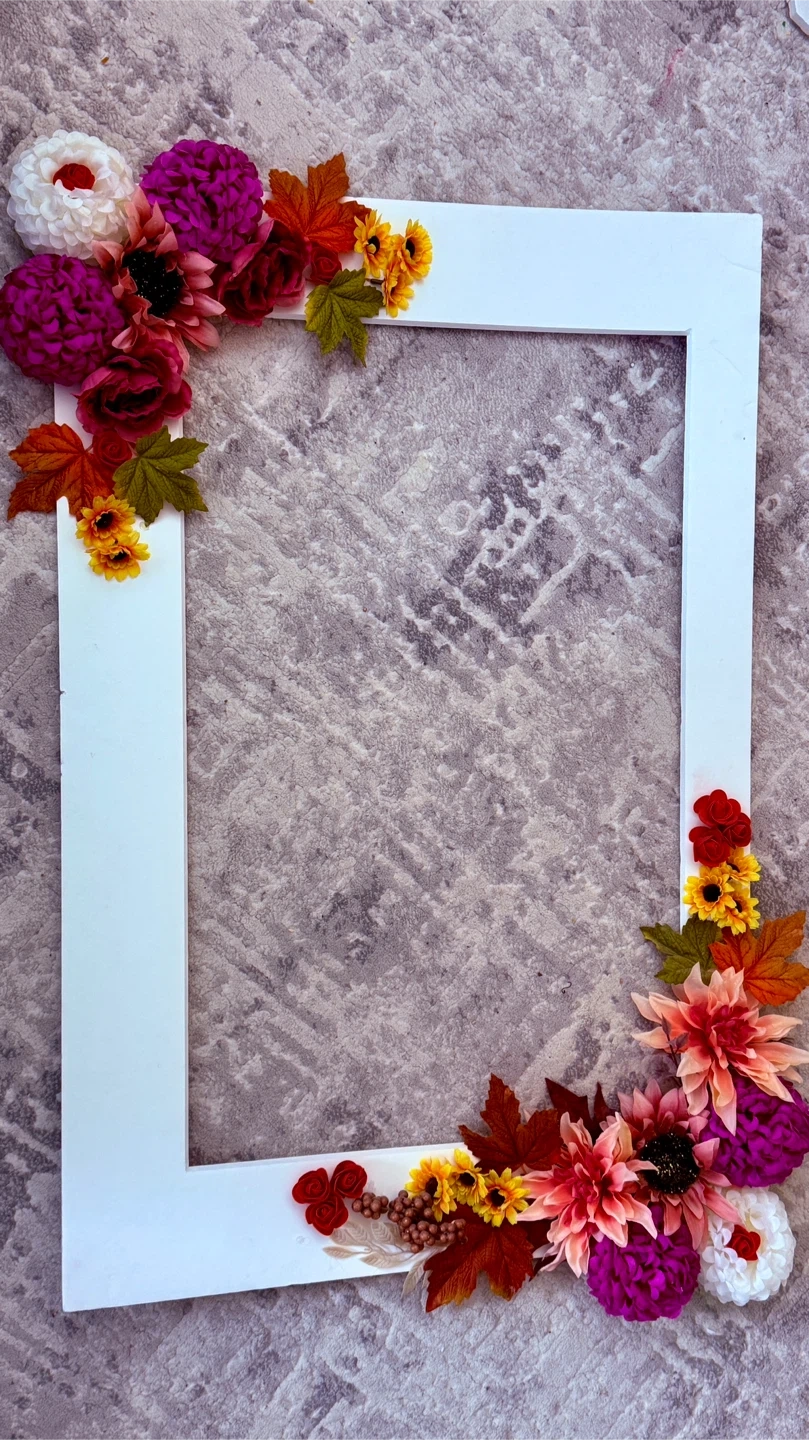 Here's a cute white picture booth frame decorated with colourful flowers and leaves! It's perfect for adding a touch of charm to any room or any occasion.