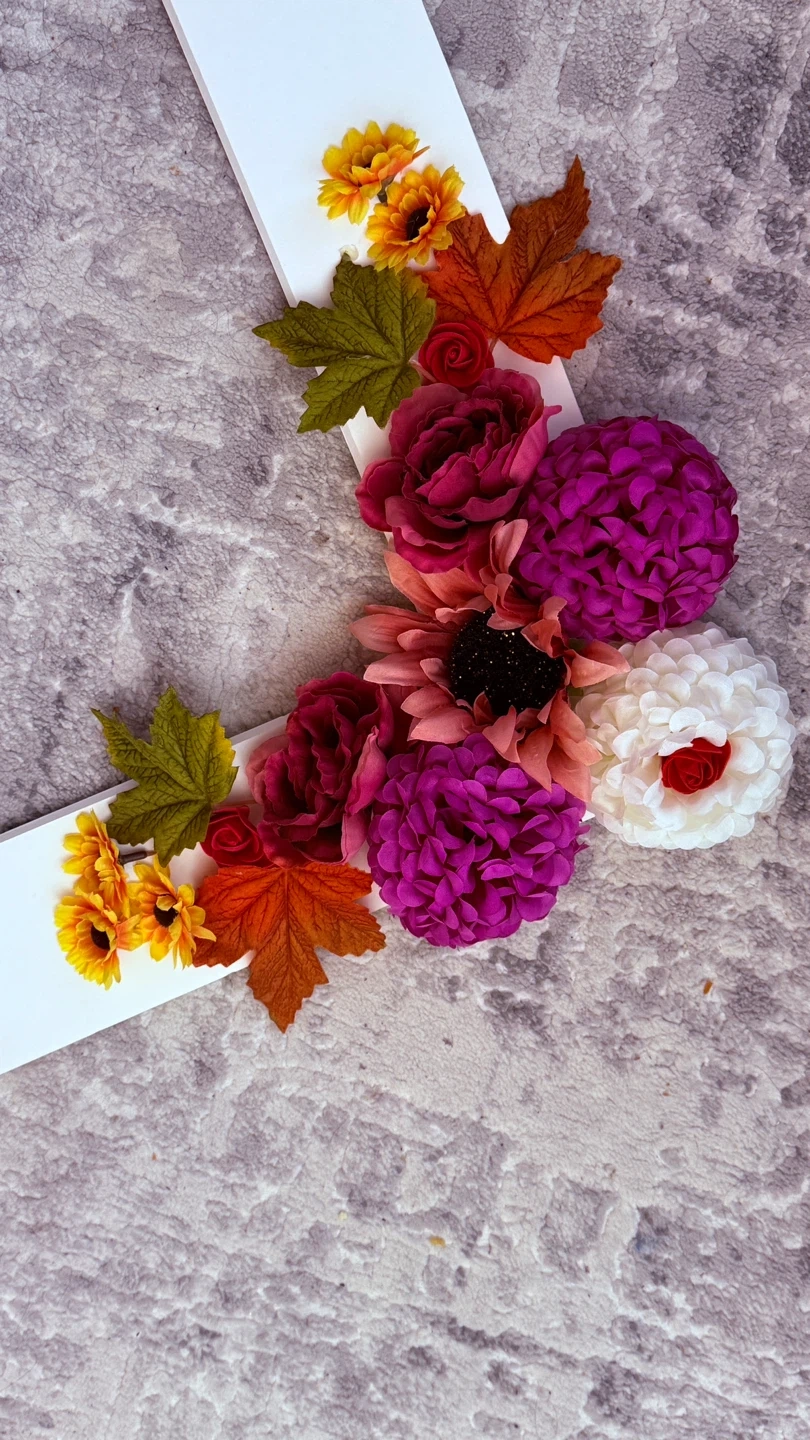 Here's a cute white picture booth frame decorated with colourful flowers and leaves! It's perfect for adding a touch of charm to any room or any occasion.