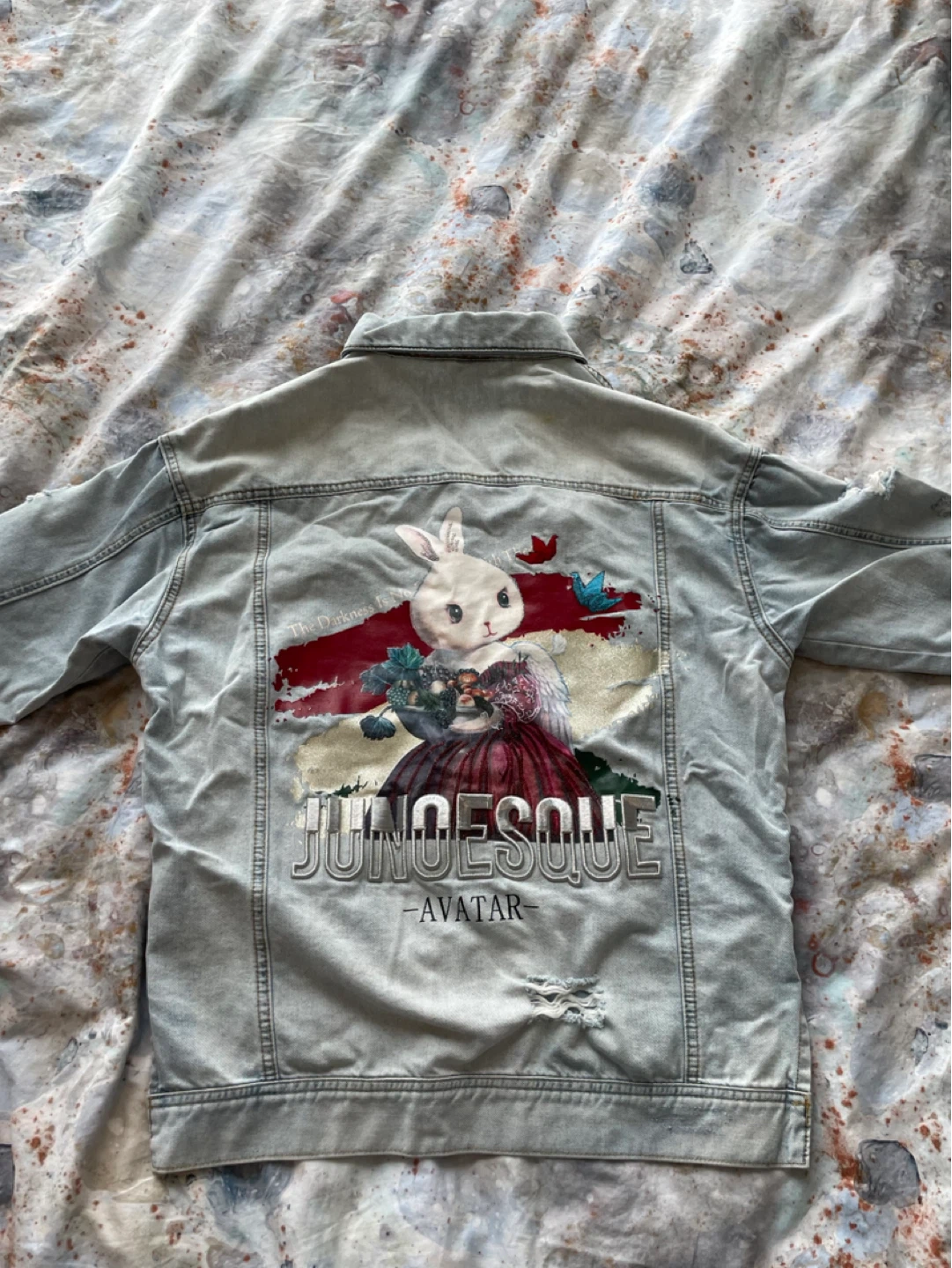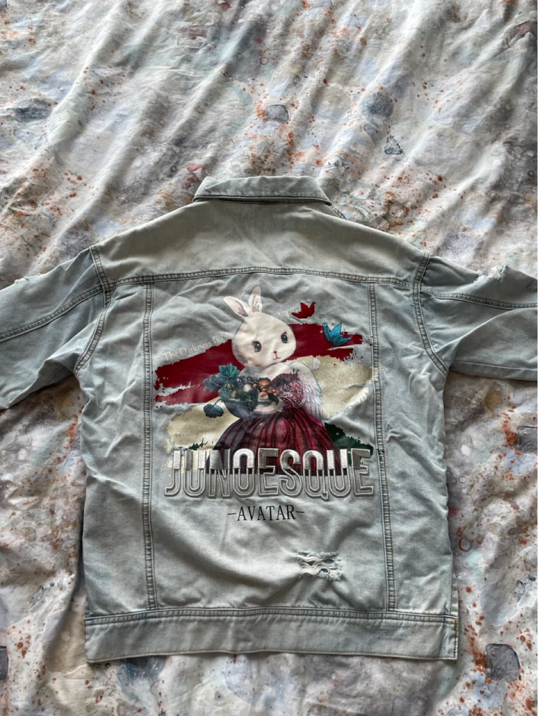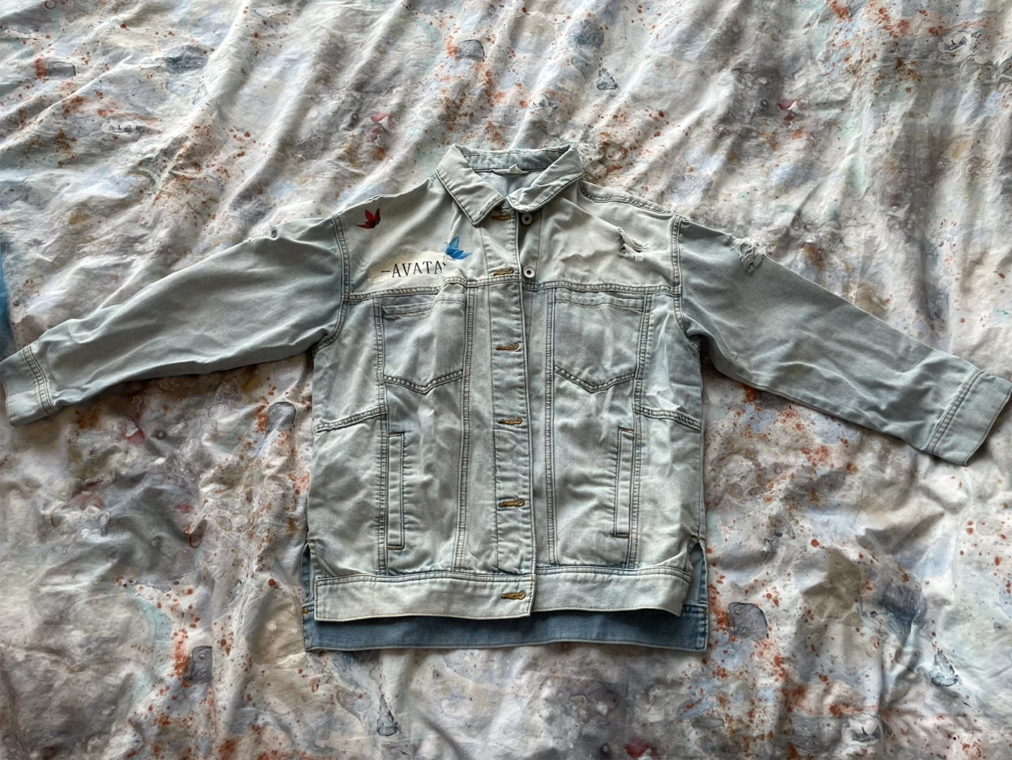 Selling a cool Avatar denim jacket! It's a light wash with unique designs on the front and back. The size is 160/84A (38). It's in great condition and ready for a new owner!