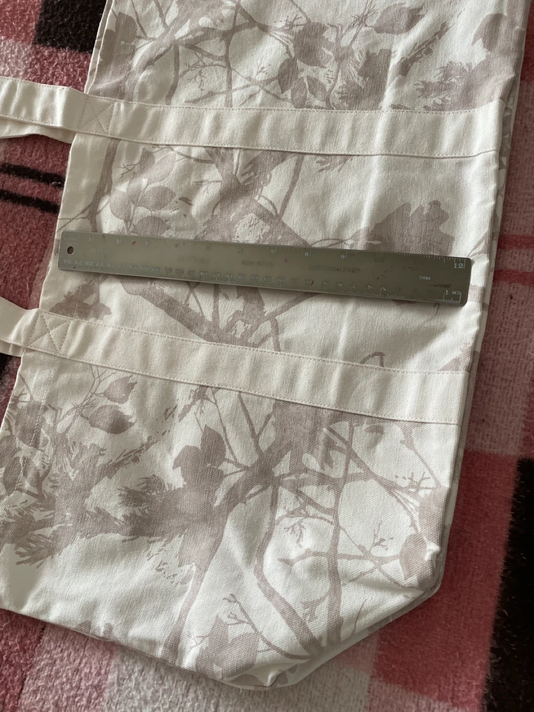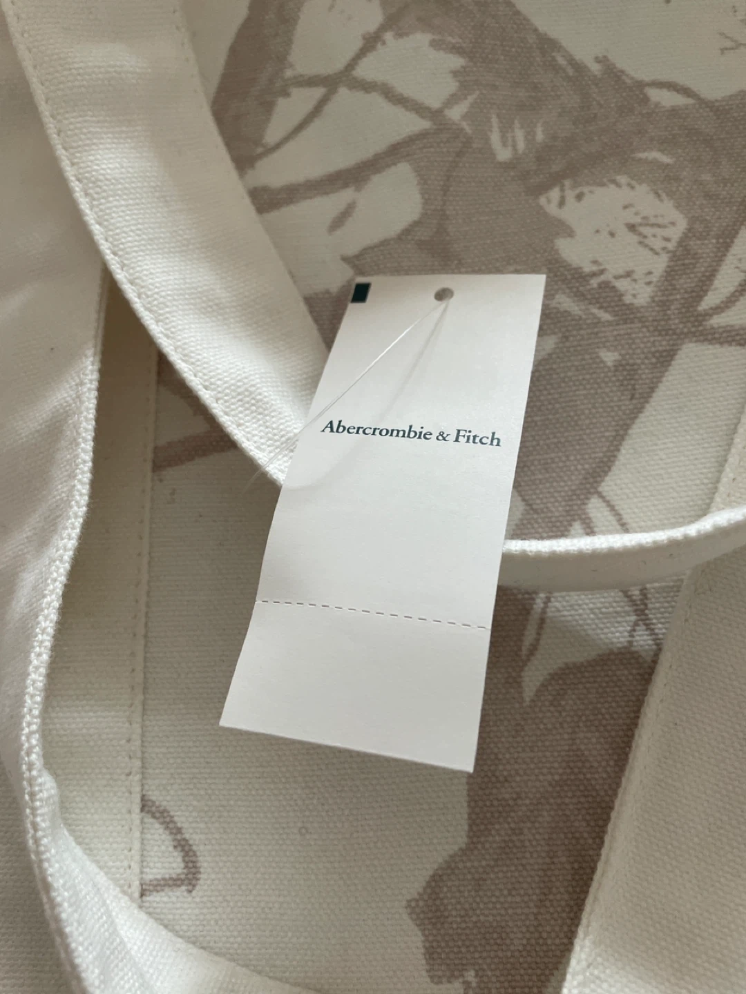 Here's an Abercrombie & Fitch tote bag! It's a stylish and practical accessory, perfect for carrying your essentials. The bag features a neutral colour palette with a subtle tree branch pattern. It also has a magnetic snap closure to keep your items secure