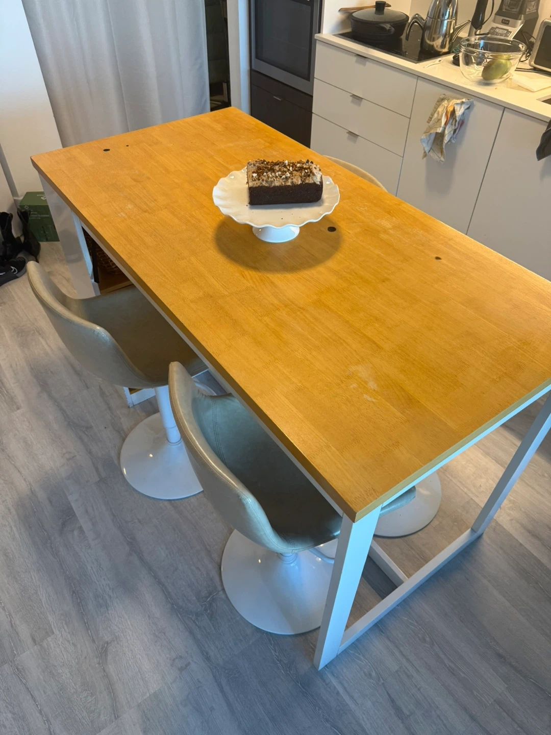 Selling a kitchen island! The island has a light wood top and a white base with some built-in shelving. It's approximately 59 inches long and 29 inches wide. Great for extra counter space and seating in your kitchen!