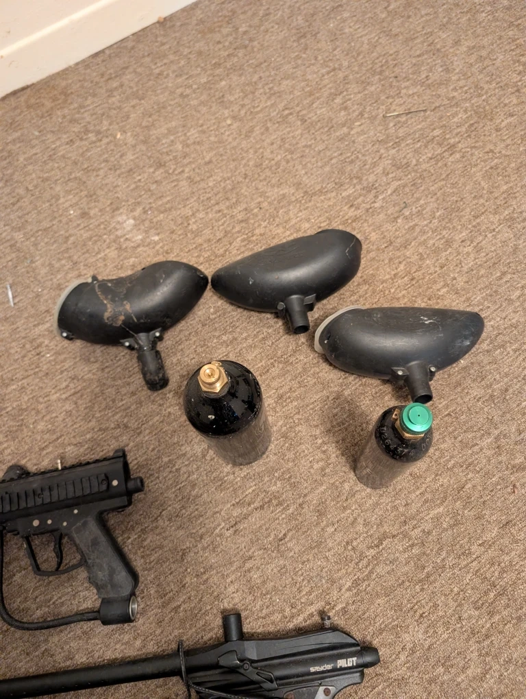Selling a lot of paintball guns and accessories. Includes a Spyder Pilot and an Outkast paintball gun, along with some tanks and hoppers. Great for anyone looking to get into paintball!