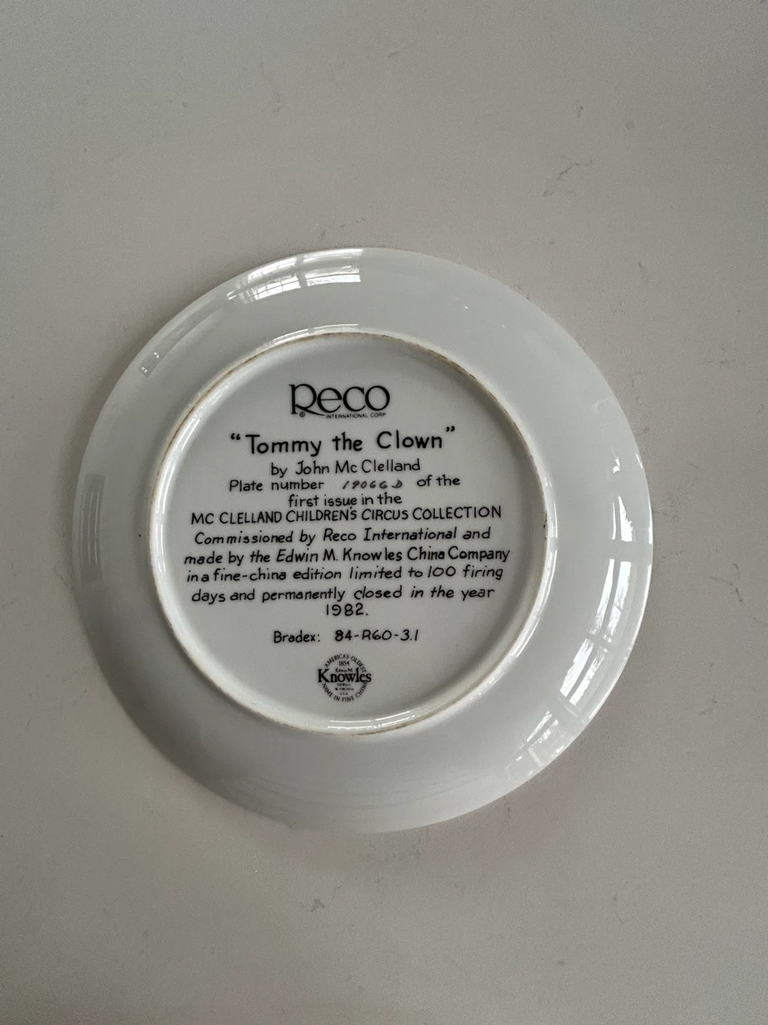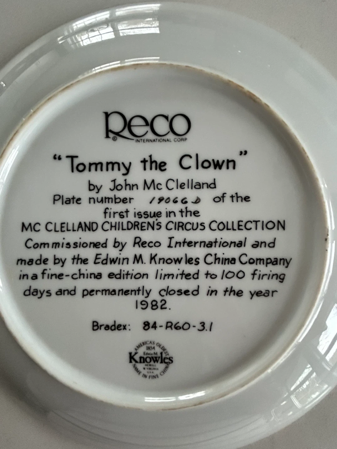 Reco International Corp. "Tommy the Clown" plate by John McClelland. Plate number 19066 of the first issue in the MC CLELLAND CHILDREN'S CIRCUS COLLECTION. Commissioned by Reco International and made by the Edwin M. Knowles China Company in a fine-china edition limited to 100 firing days and permanently closed in the year 1982. Bradex: 84-R60-3.1