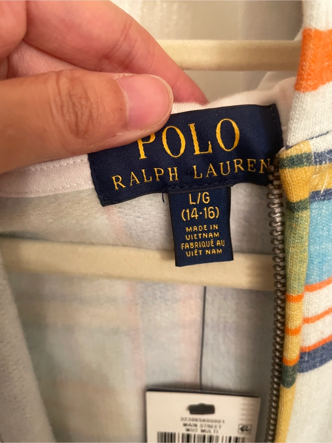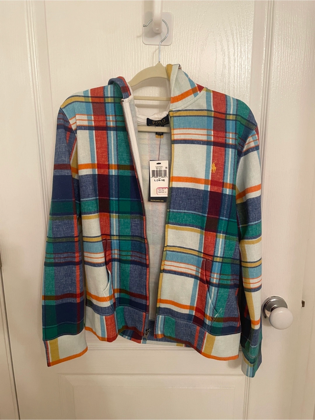 Brand new with tags Ralph Lauren plaid hoodie in size L (14-16)! The tag shows it was originally $89.50. It's a super cute design and comfortable material.