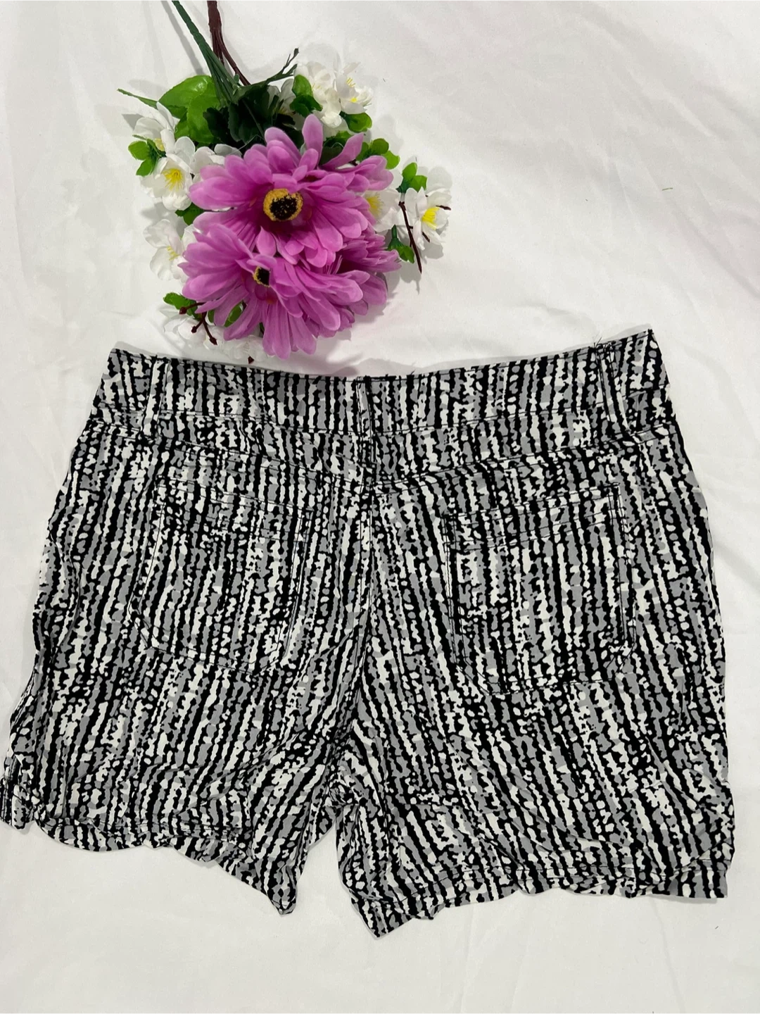 Here are some gently used Bottoms brand women's shorts in size 6. They feature a stylish black and white pattern. Perfect for a casual day out!