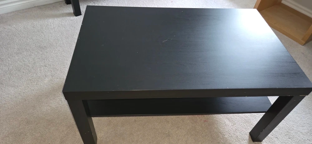 Selling a black IKEA Lack coffee table. It's in good condition and perfect for any living room! It features a handy shelf underneath for storage or decor