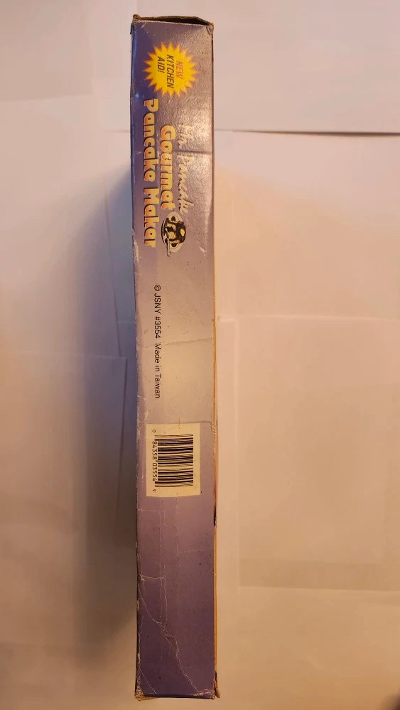 Here's a Mr. Pancake Gourmet Pancake Maker! It's a double-sided, non-stick pan that makes pancakes without needing a spatula. It’s designed for easy pouring and flipping for the best pancakes you’ve ever tasted. The box is included and highlights the non-stick surface, stay-cool handles, dishwasher-safe design, and quality craftsmanship