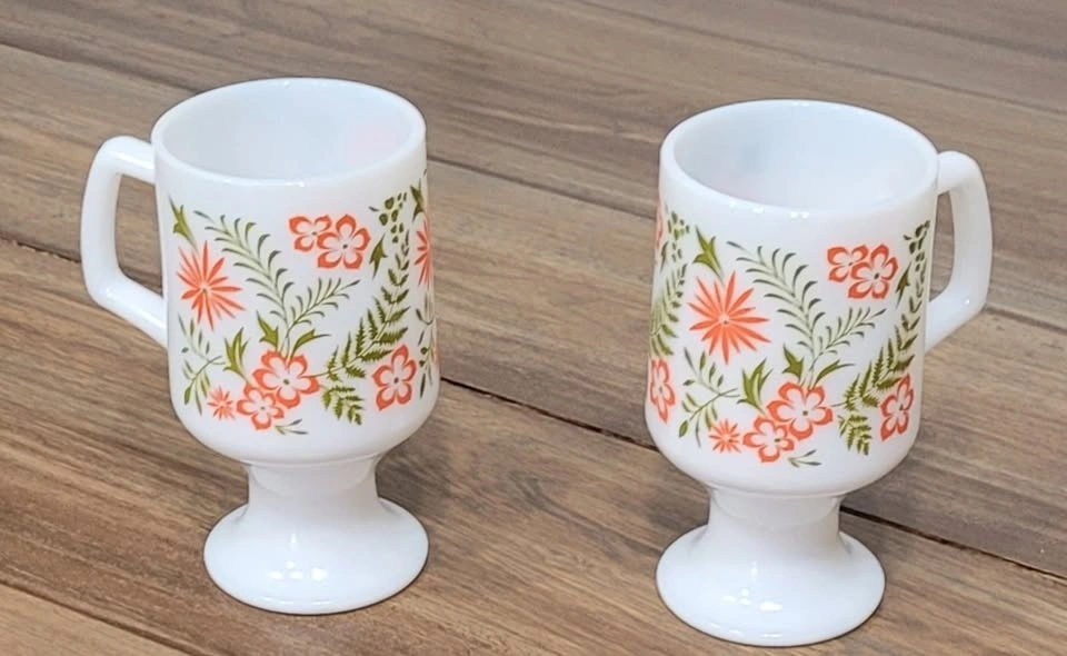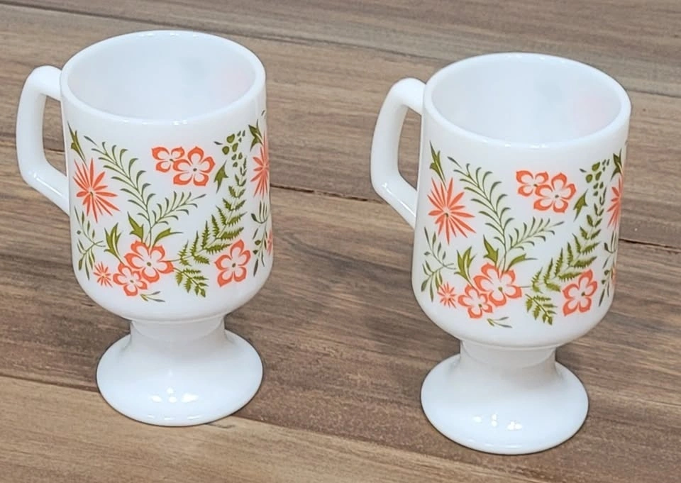 1970's Milk Glass Orange Daisies and Green Ferns Footed Pedestal Coffee Mug Cups