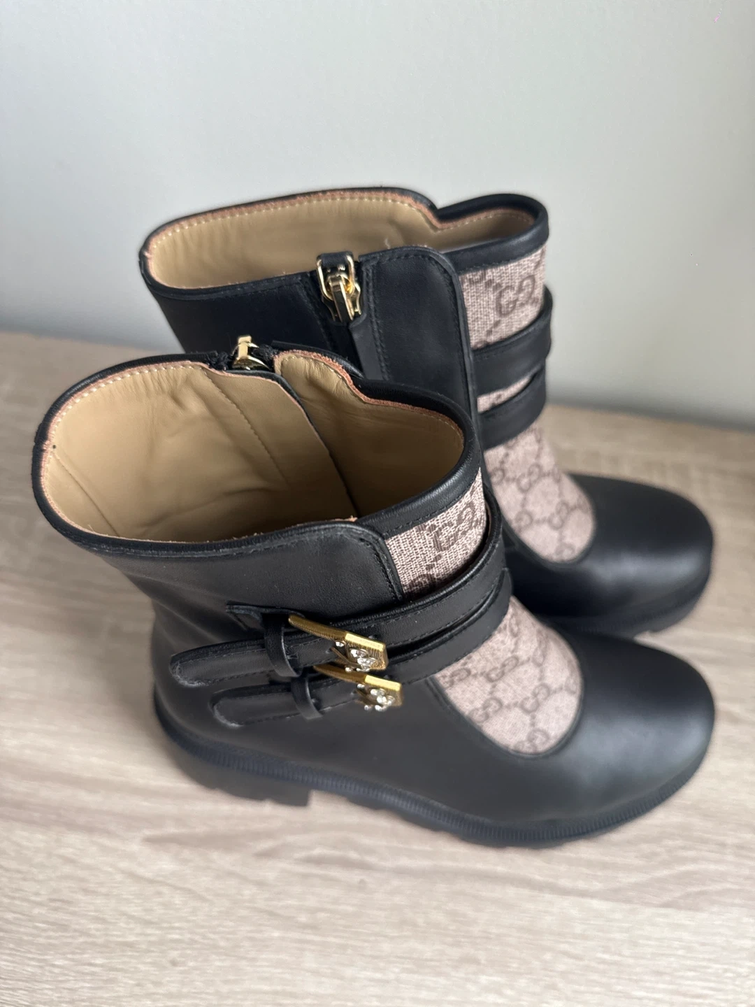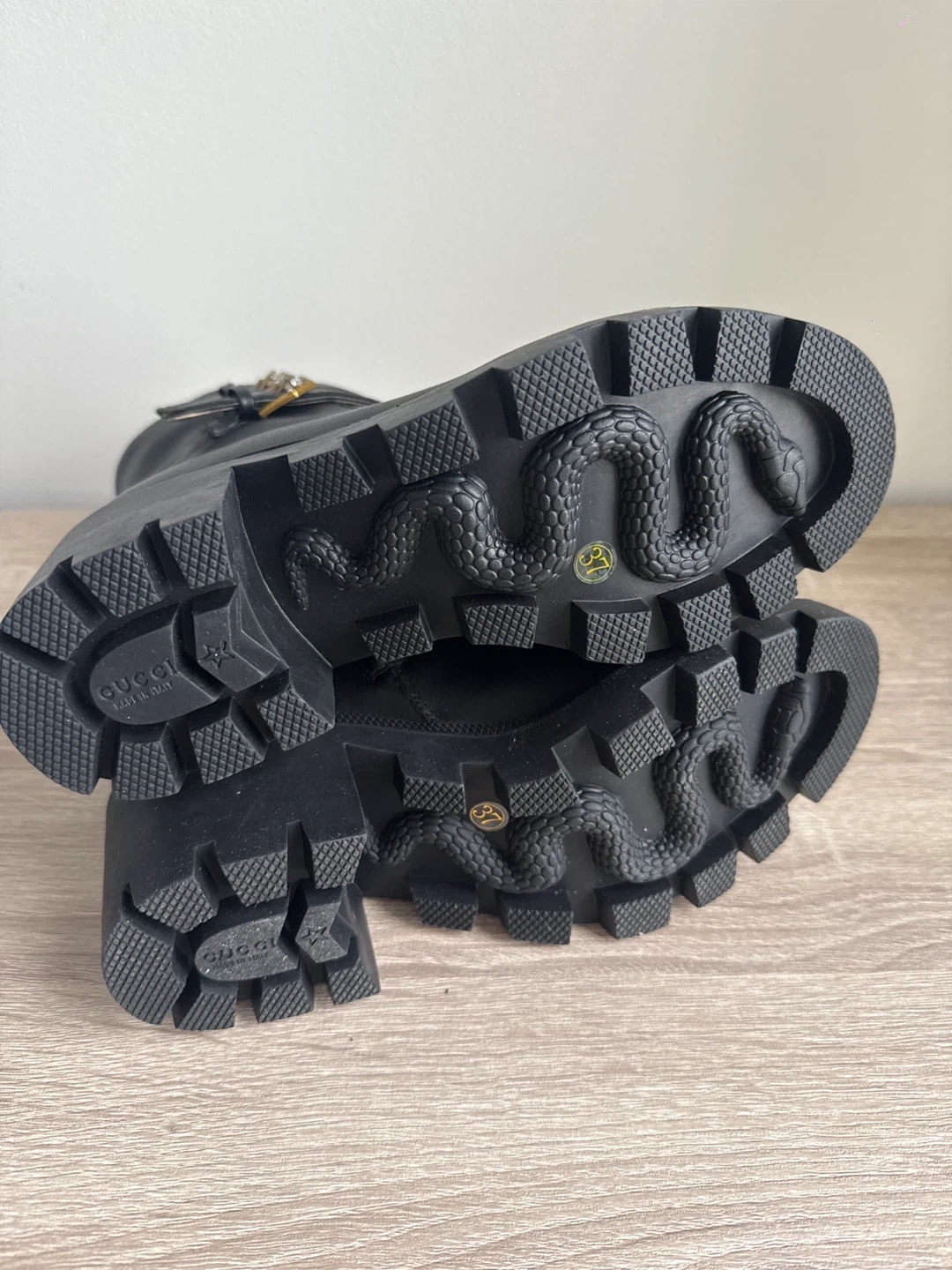 1:1, Gucci ankle boots in black leather. They feature the Gucci logo pattern on the sides and straps with gold-tone buckles. The soles have a snake design.