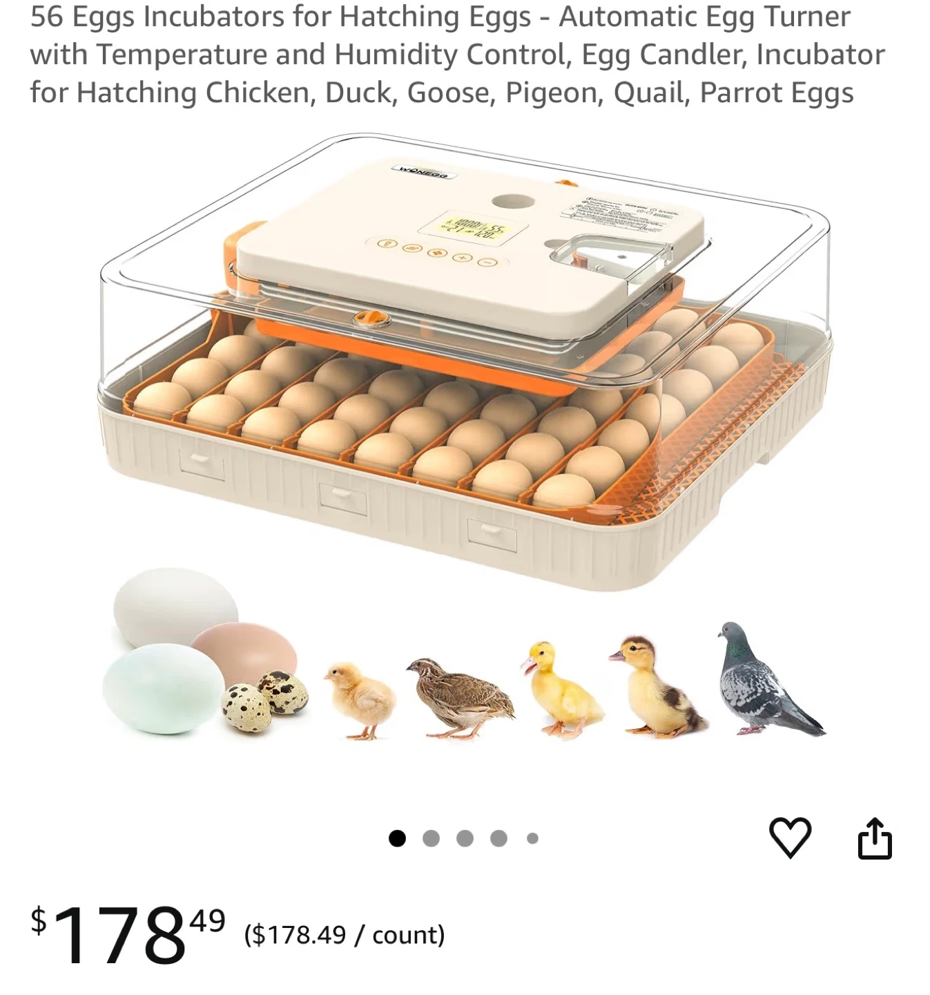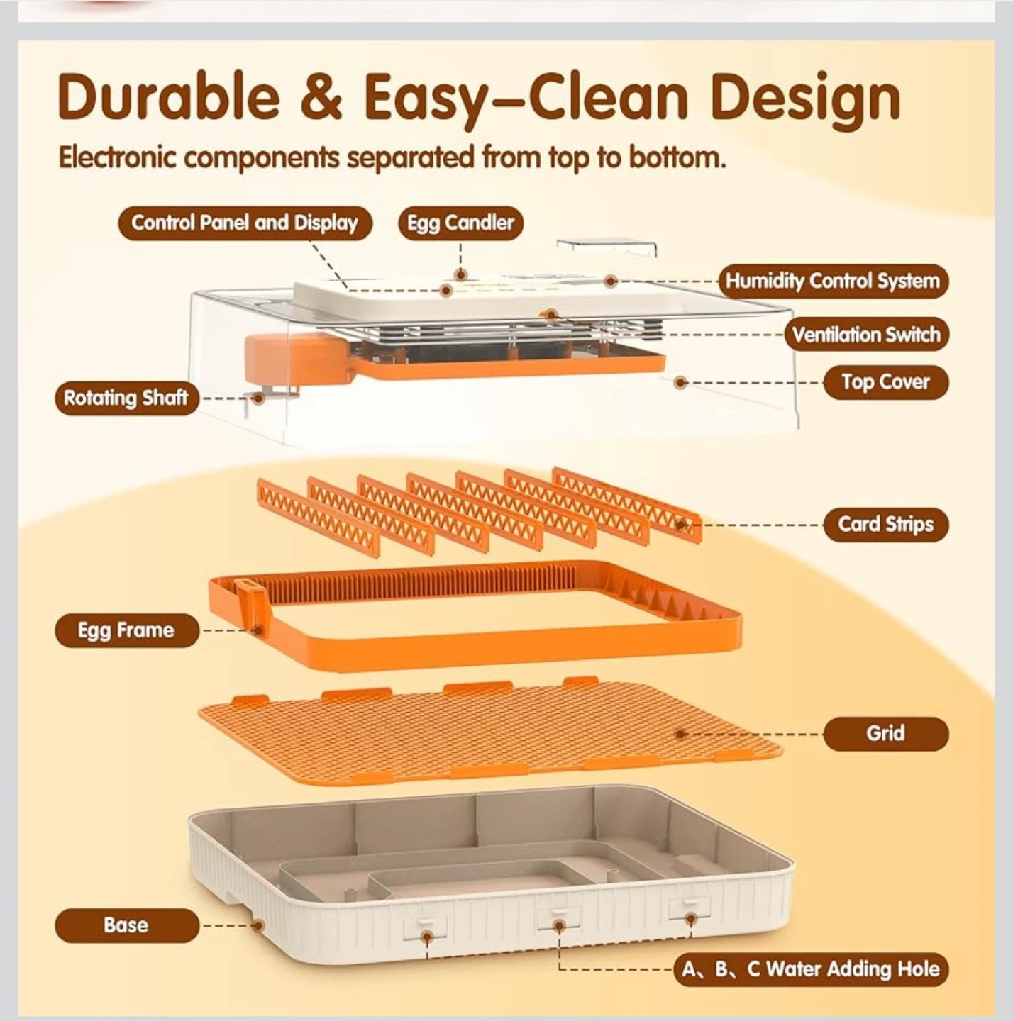 This incubator has a smart temperature-control system for a high hatch rate. It keeps a stable temperature inside and features a new automatic humidification system. It also has an auto egg turning feature and smart turning stop 3 days before hatching. Originally bought for $178.49