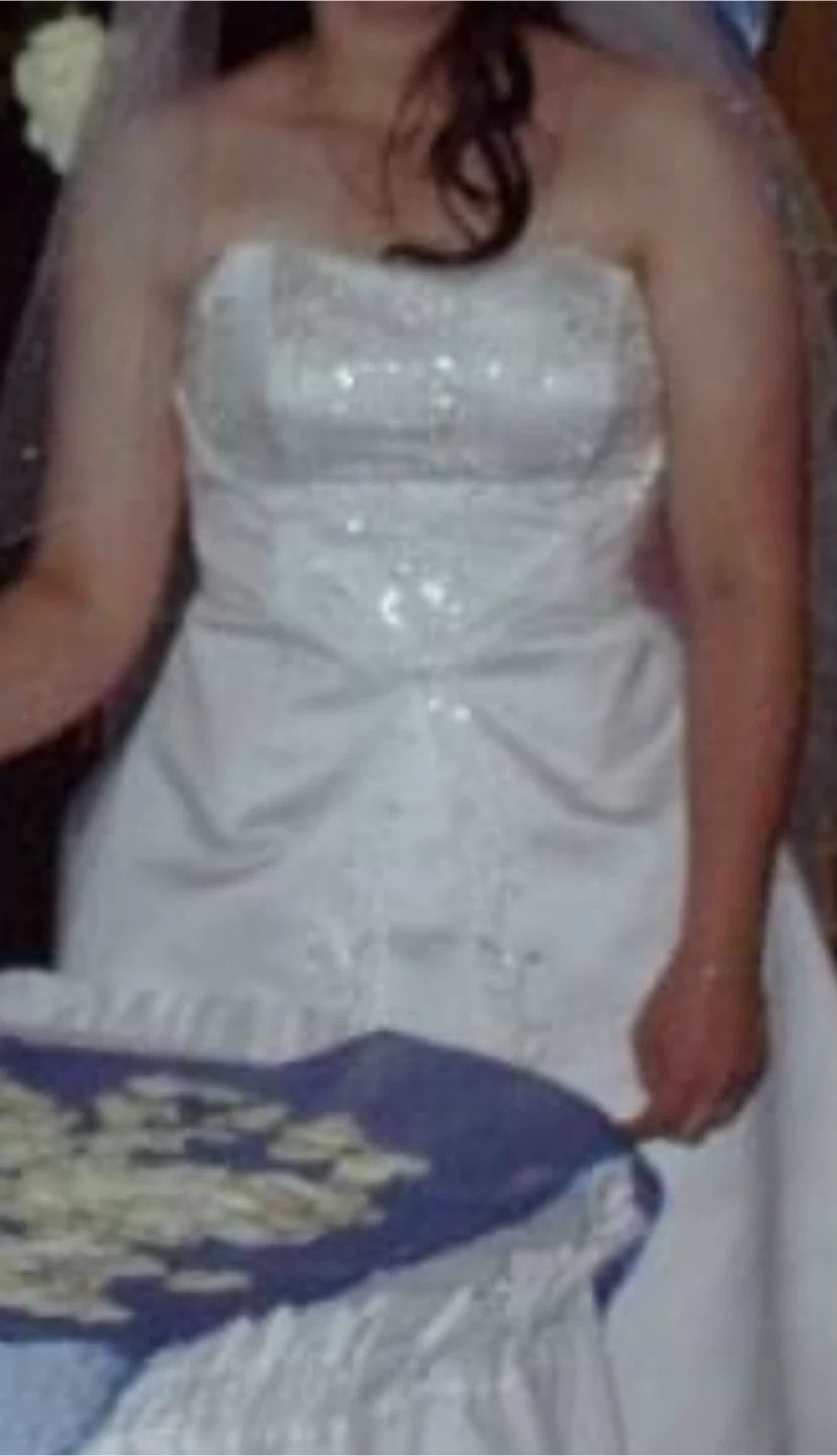 Selling a beautiful white wedding dress. Hemmed to height of 5 foot 1. It has a strapless design with floral embroidery. It's in good condition and ready for its next special day