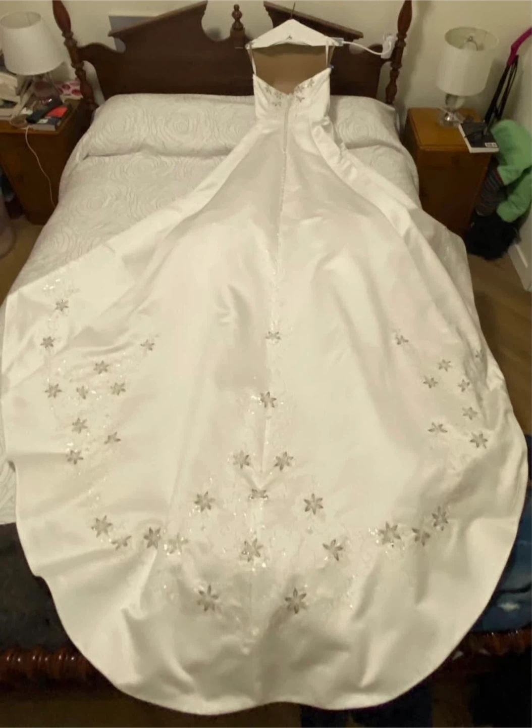 Selling a beautiful white wedding dress. Hemmed to height of 5 foot 1. It has a strapless design with floral embroidery. It's in good condition and ready for its next special day