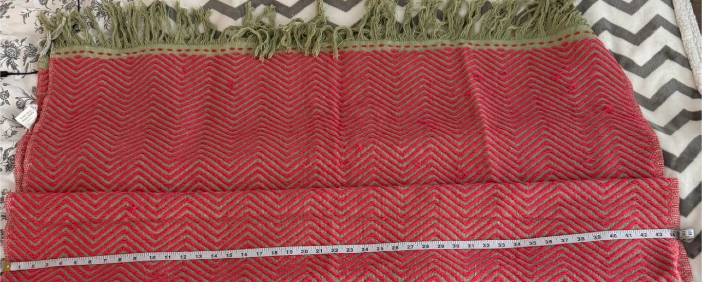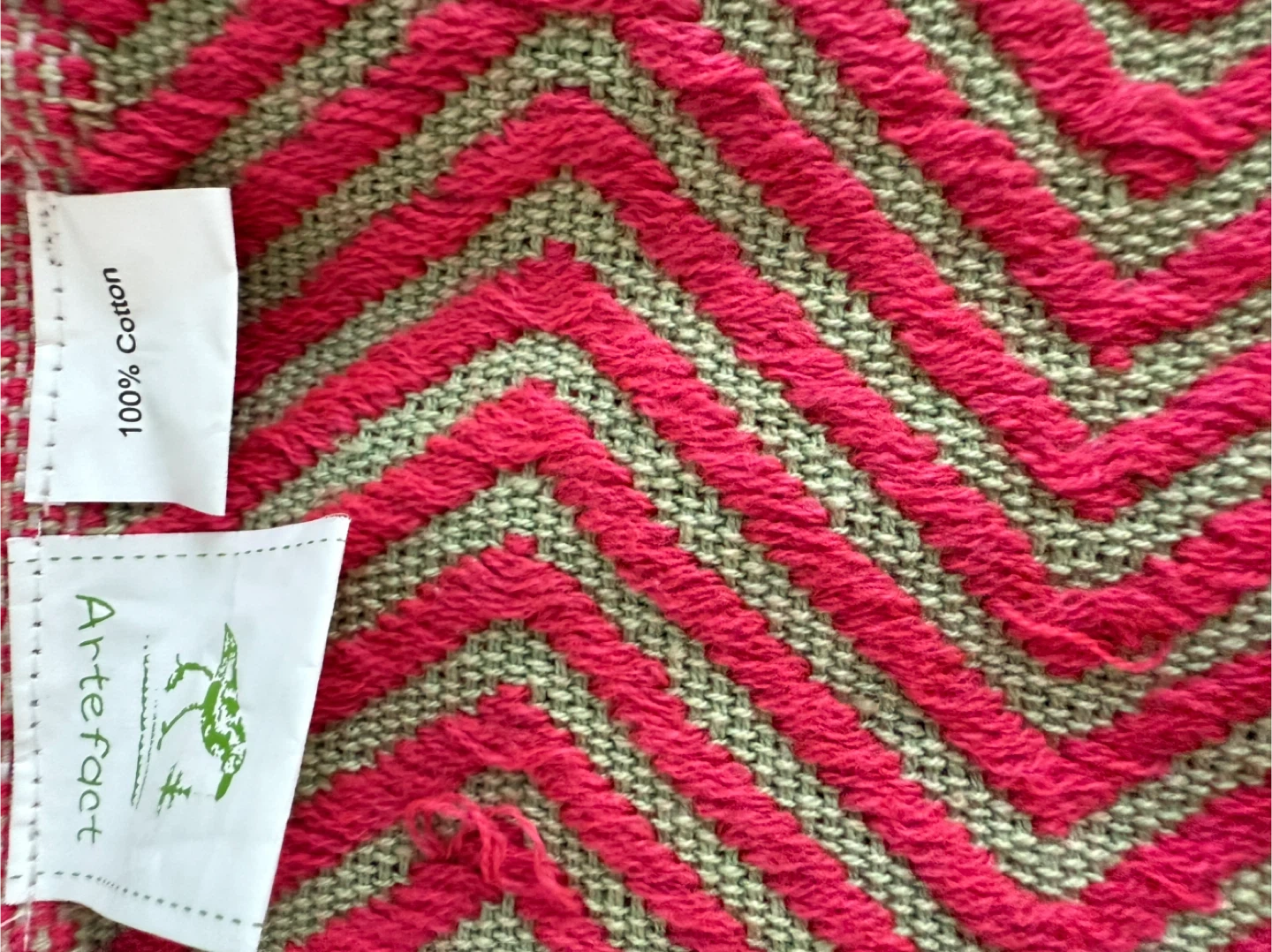 Selling a lovely Artefact throw blanket! It features a vibrant pink and green chevron pattern. The material is 100% cotton, and it's made with love from India. It measures approximately 43 inches by 59 inches. Dry clean only