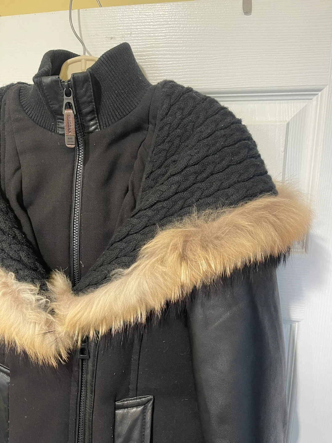 Elegant black RUDSAK jacket with brown fur trim. Features leather sleeves and sleek design. Barely worn and in great condition. Size small. It’s a double zipper and very warm. It has a knitted wool neckline pattern.