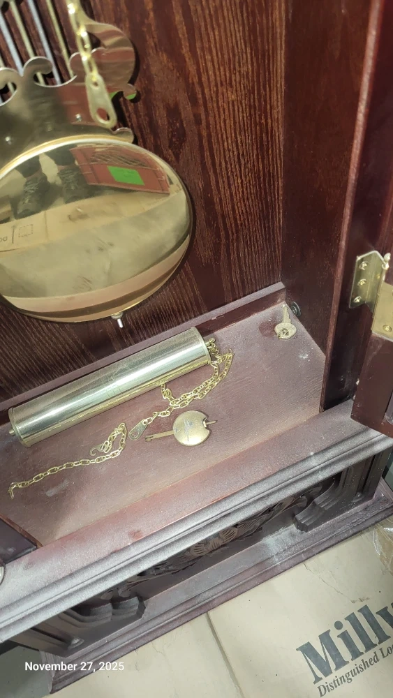 I'm selling a beautiful grandfather clock. It would make a great statement piece for any home! The clock is a dark wood colour with a gold pendulum. It's in good condition and ready for a new home