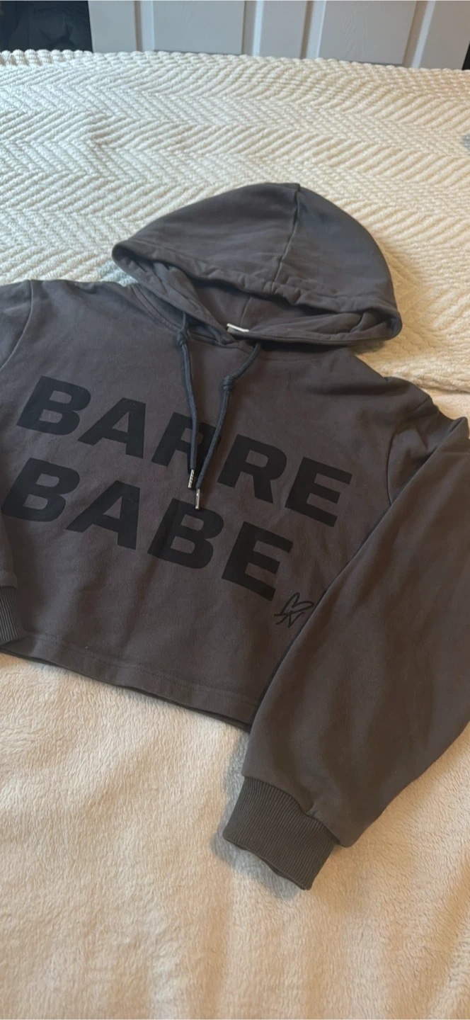 Selling a gently used Barre Babe cropped hoodie. It's a size small and has a cool, relaxed fit. The material is soft and comfy, perfect for workouts or just lounging around. Check out the pics!