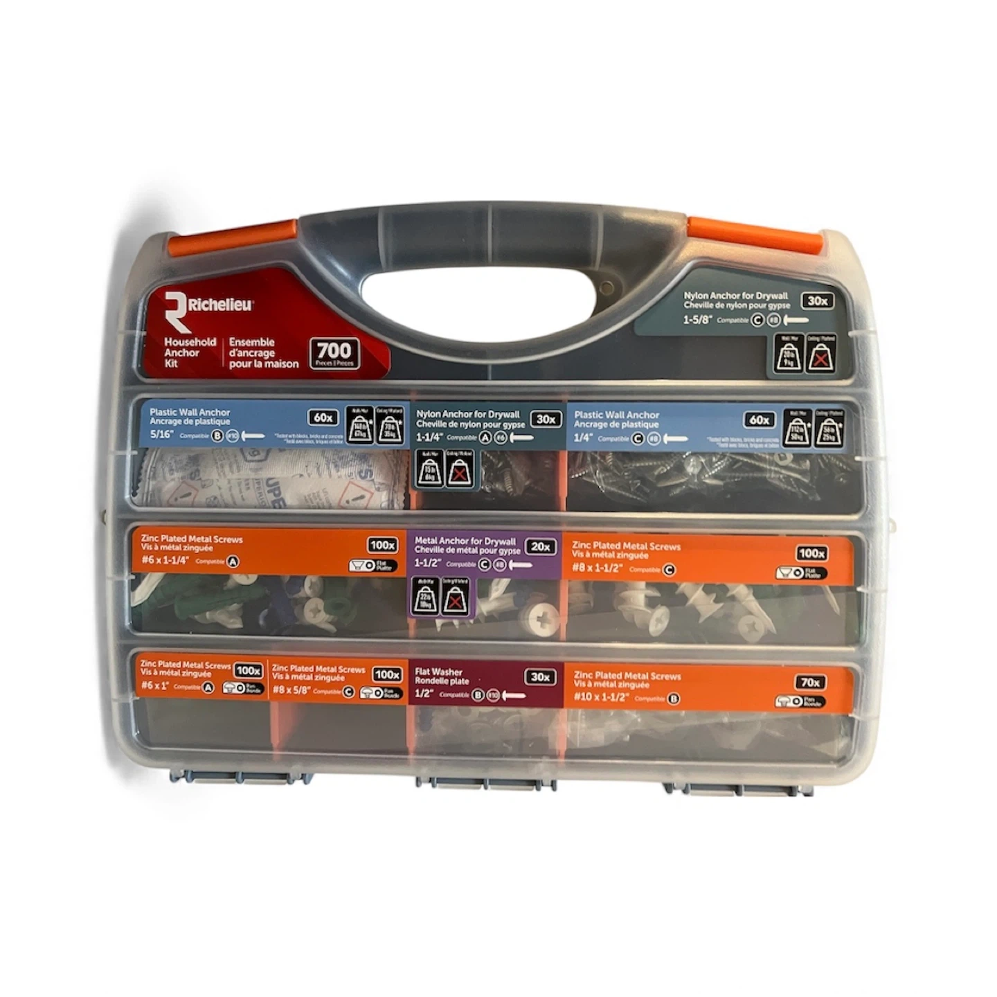 Selling a Richelieu Household Anchor Kit with 700 pieces! It includes a variety of plastic wall anchors, nylon anchors for drywall, zinc plated metal screws, and flat washers. Perfect for any household project!