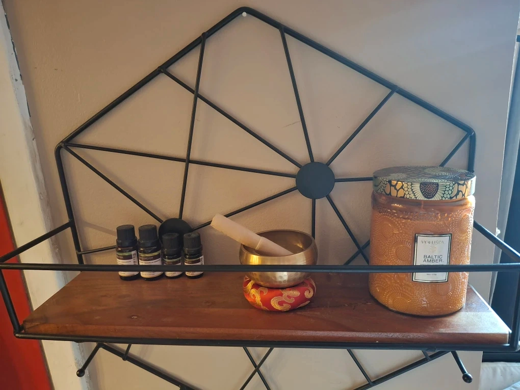A stylish sturdy geometric wall shelf with a wooden shelf. The frame is black metal, and it has a unique design.