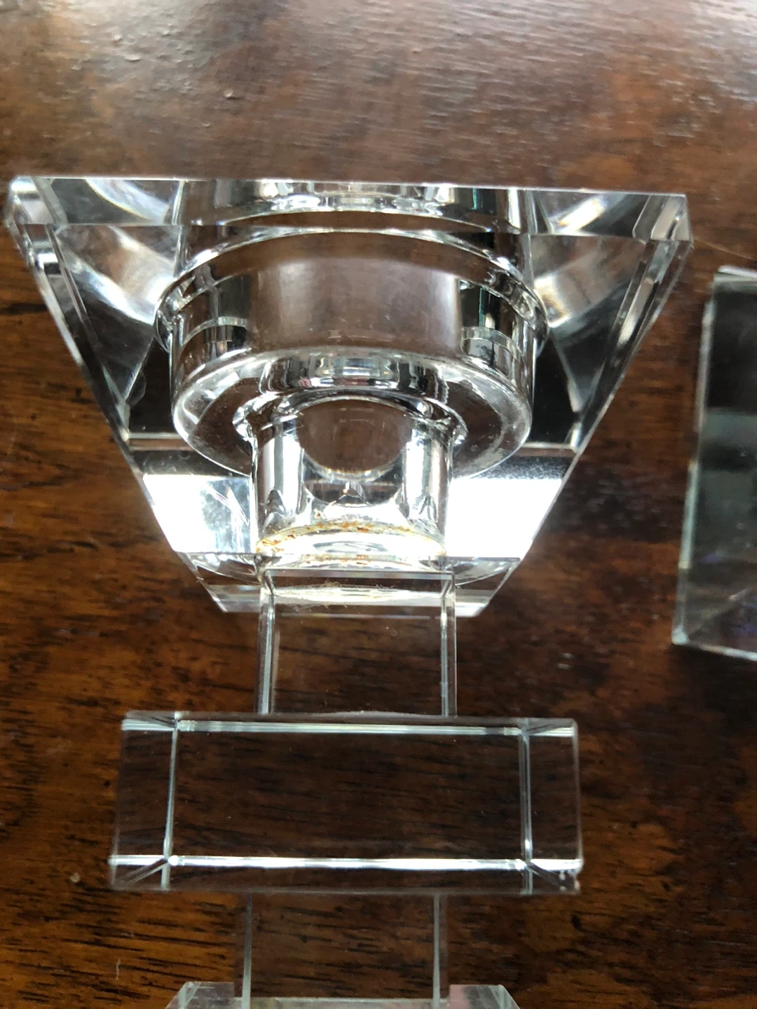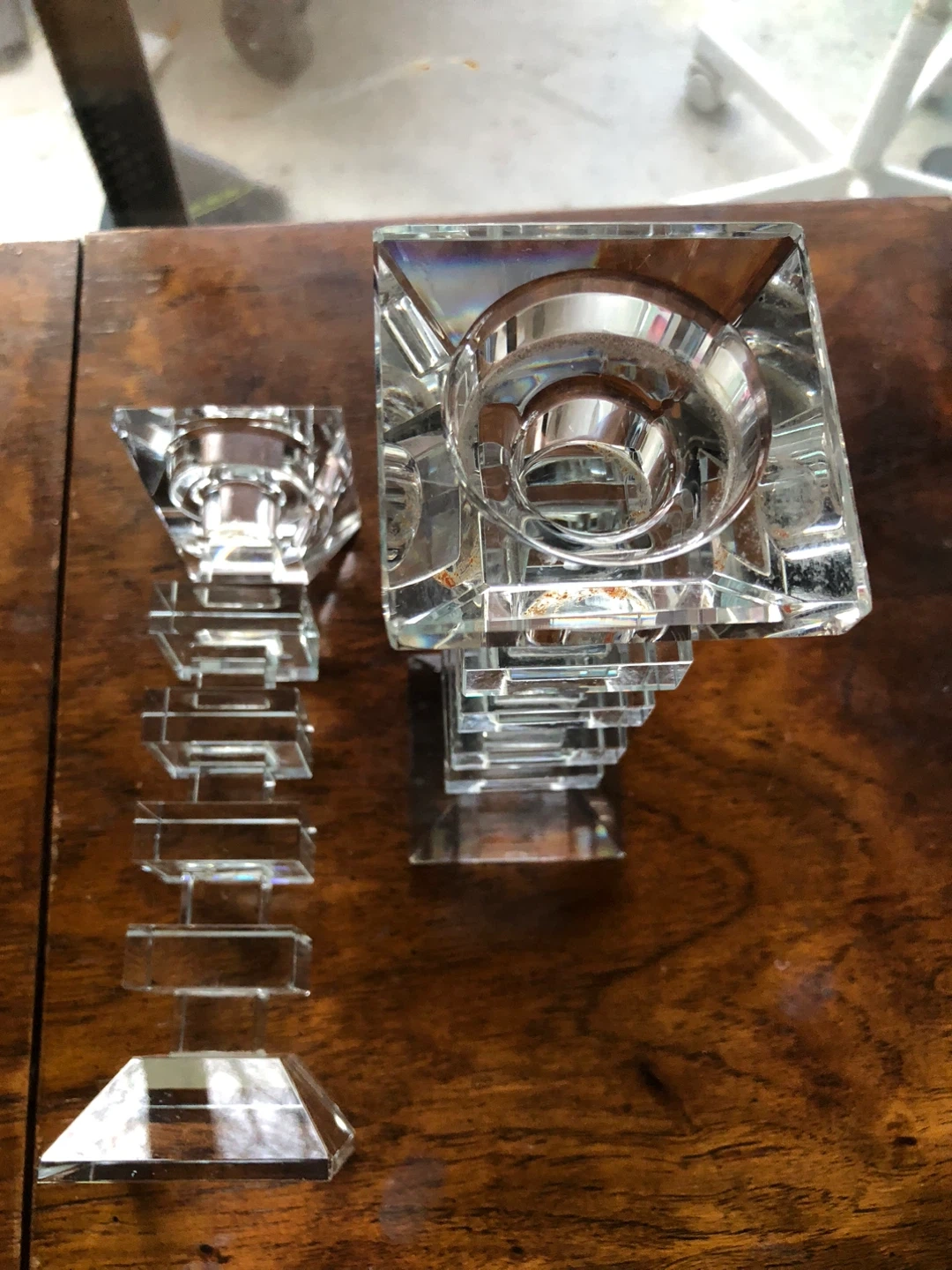 *Pristine* set of 2 (both pieces only used once in a display) 8 inches tall crystal candle holders. There are zero cracks, chips nor any other sort of damage. They have a unique, geometric design and would look great on a dining table or mantle. They hold any sort of tea light or tall wick. 6’x 6’