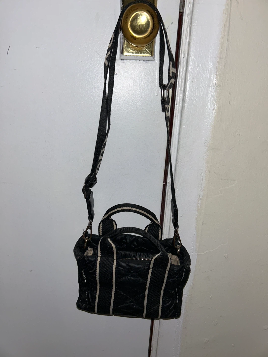 Selling a gently used MZ Wallace Micro Sutton bag in black quilted nylon. It's a cute and versatile little bag! The bag features the words 'NOT ORDINARY' around the edges.