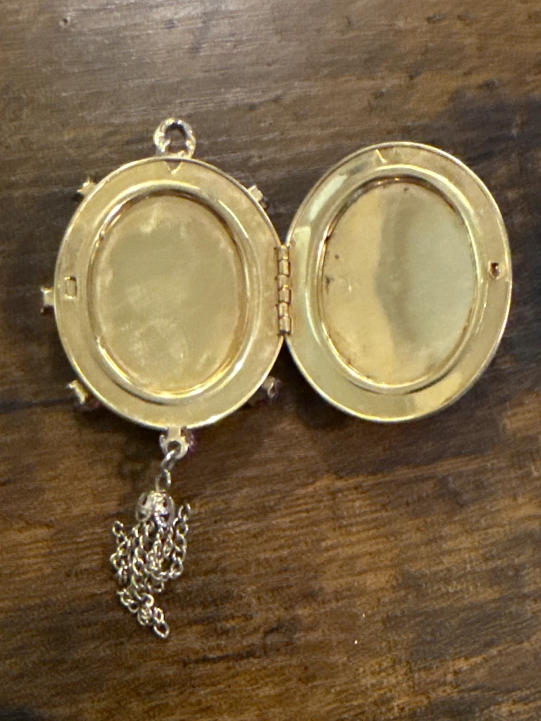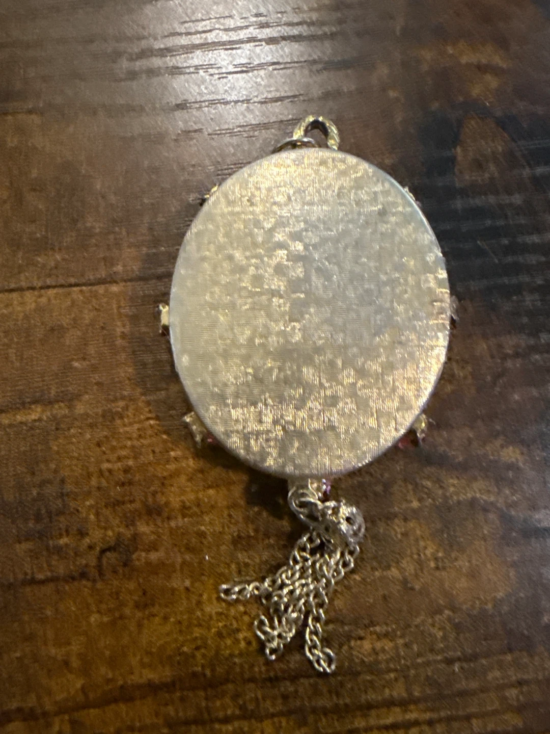 This is a vintage-style brooch featuring a romantic scene and pink accents. It has a gold-tone finish and a small chain tassel. The brooch opens up, revealing two small compartments inside.