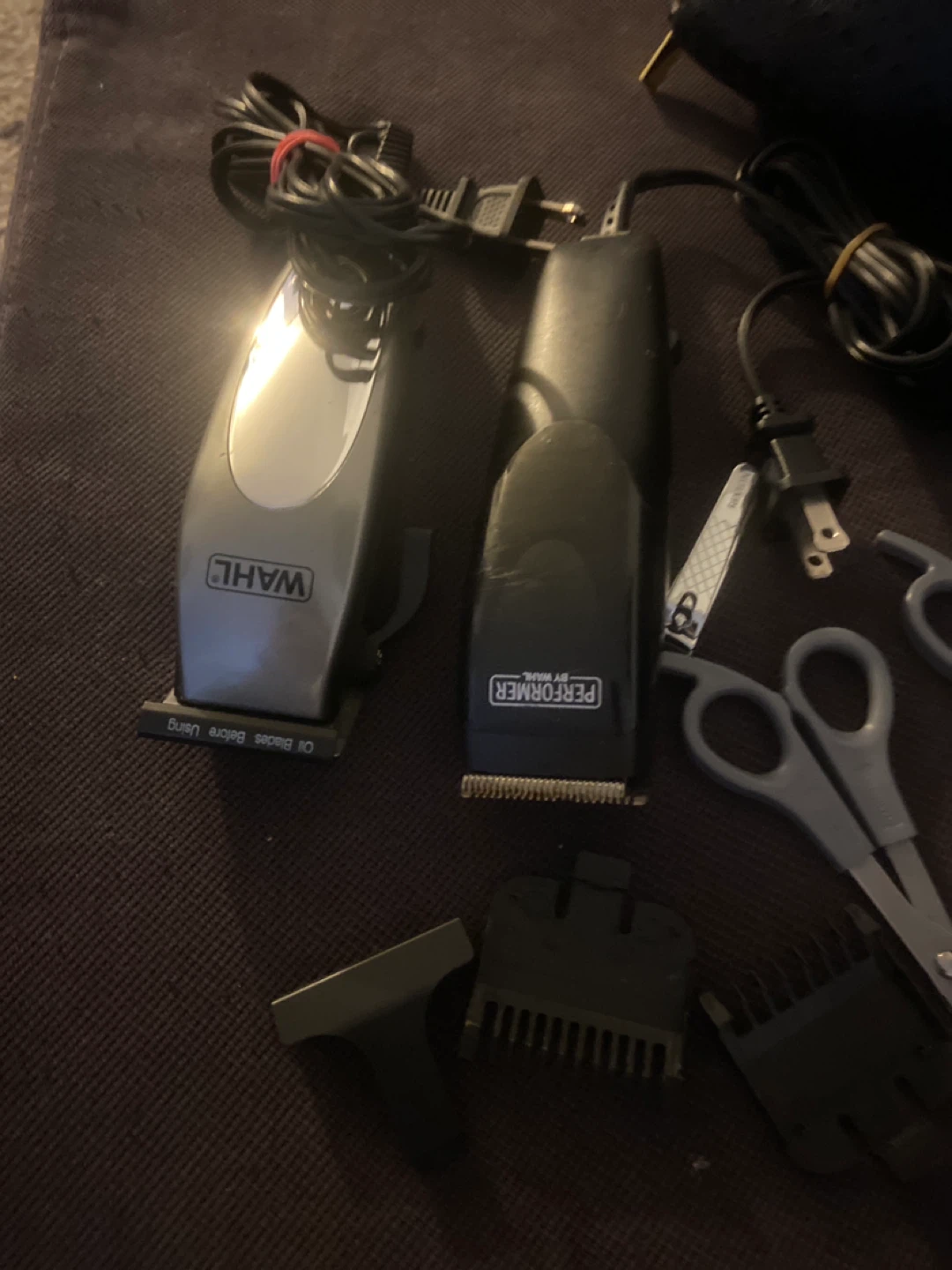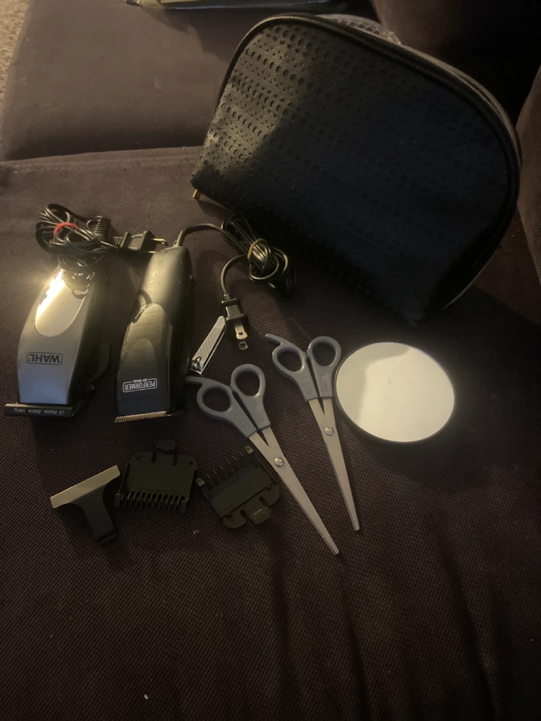Selling a Wahl hair clipper set that includes two clippers: a Wahl clipper and a Wahl Performer clipper. Also included are scissors, clipper guards, a mirror, and a carrying case. Great for at-home haircuts!