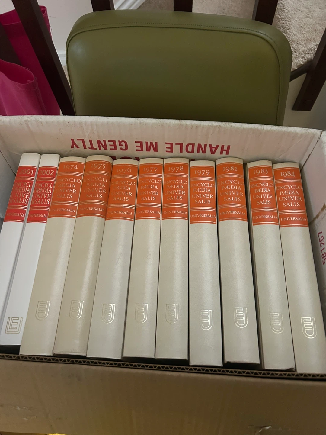 Selling a collection of Encyclopaedia Universalis books, spanning from 1974 to 2001. These books are in good condition and would be a great addition to any library or collection! They are white with gold lettering