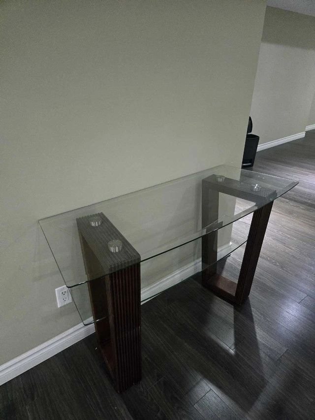 Stylish console table. Features tempered glass top and lower shelf. Dark brown wood frame with vertical lines. Curved edges add a touch of elegance. Great for living rooms or entertainment spaces. For pick-up only please. Cash and cashless payment accepted.