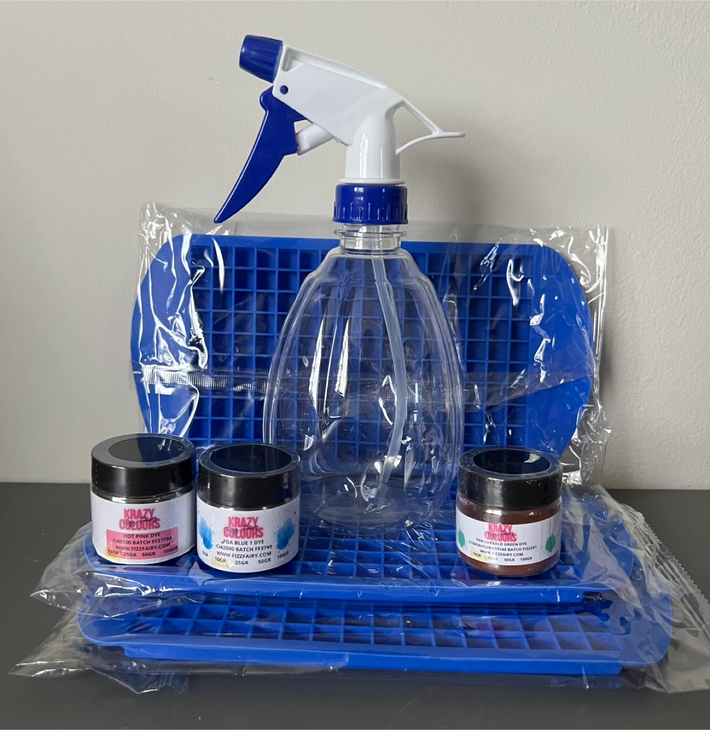 All brand new Fizz Fairy Krazy Colours Embed Starter Kit! It comes with everything you need to make your own vibrant embeds for bath bombs.