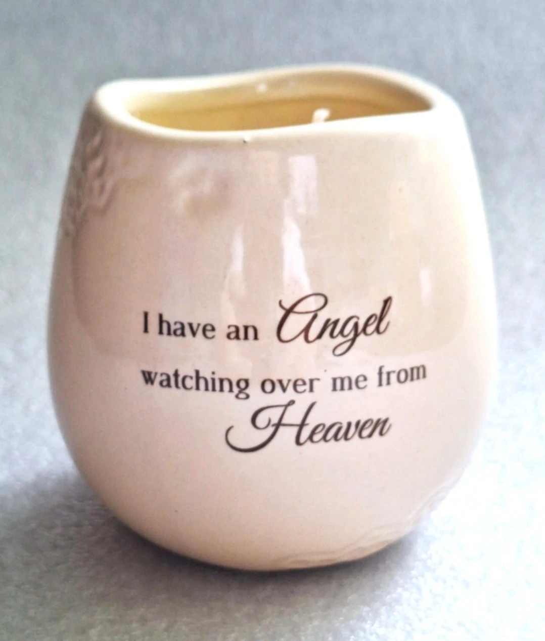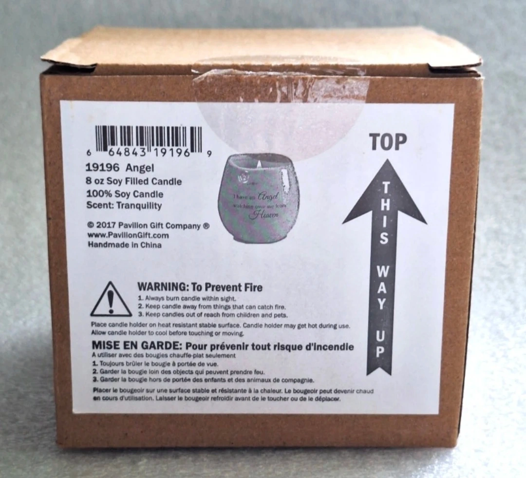 Selling an 8 oz Angel soy filled candle from Pavilion Gift. The scent is Tranquility. The candle reads, "I have an Angel watching over me from Heaven". It is 100% soy candle and comes with the original box
