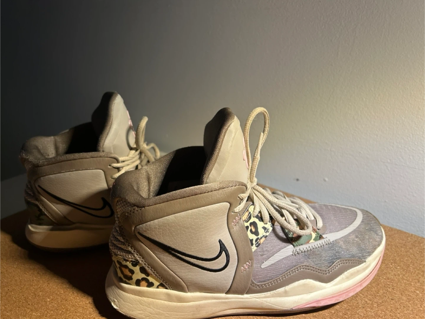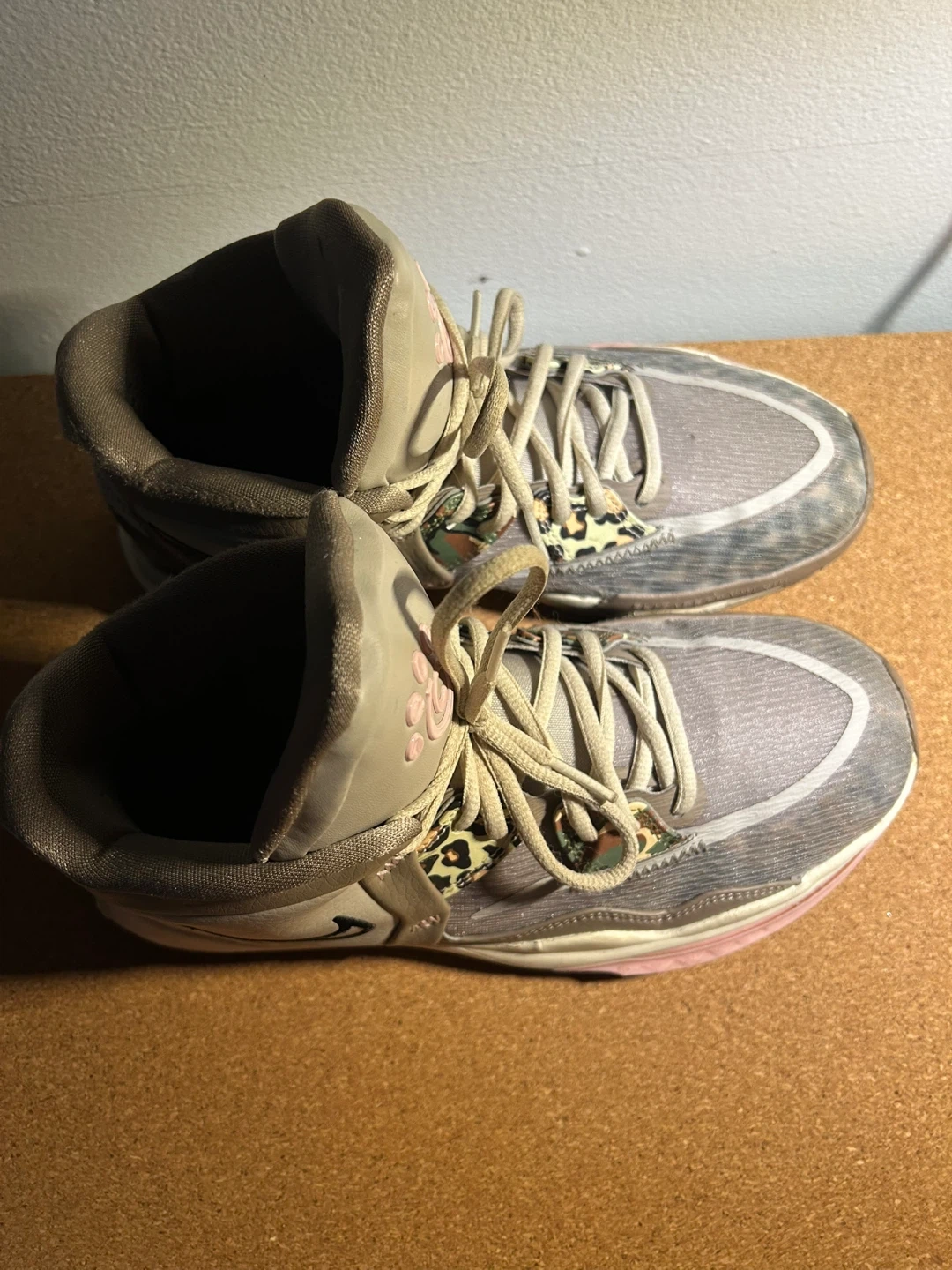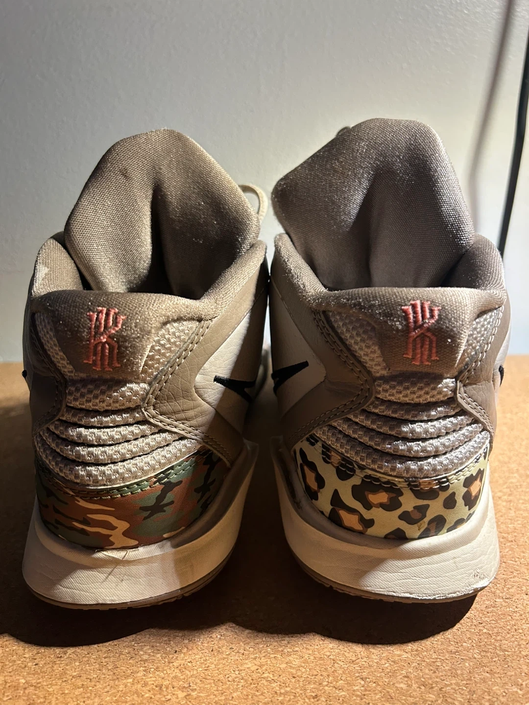 These are a pair of Nike Kyrie Infinity basketball shoes. They feature a unique design with camo and leopard print accents. Perfect for hitting the court! Worn a few times indoors