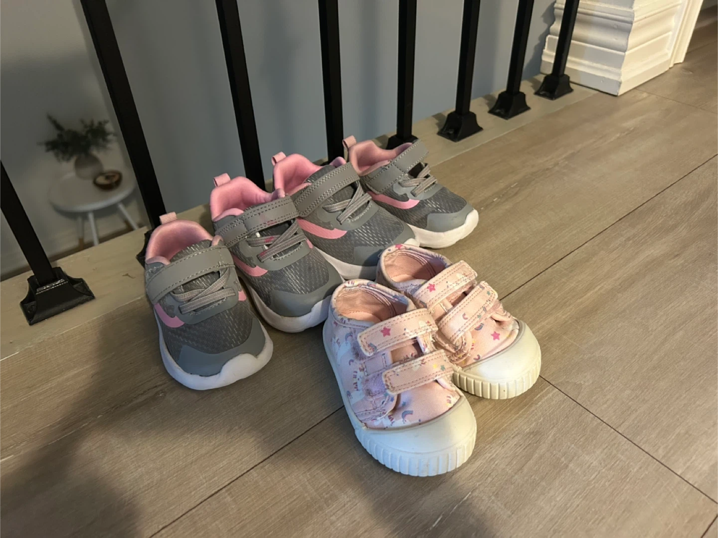 A pair of grey and pink running shoes, size 4 and a pair of pink floral print sneakers, size 4 Both pairs have Velcro closures.