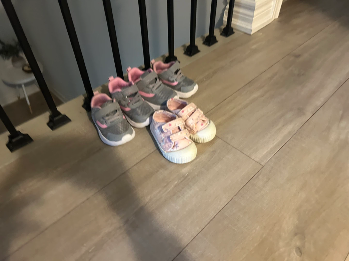 A pair of grey and pink running shoes, size 4 and a pair of pink floral print sneakers, size 4 Both pairs have Velcro closures.