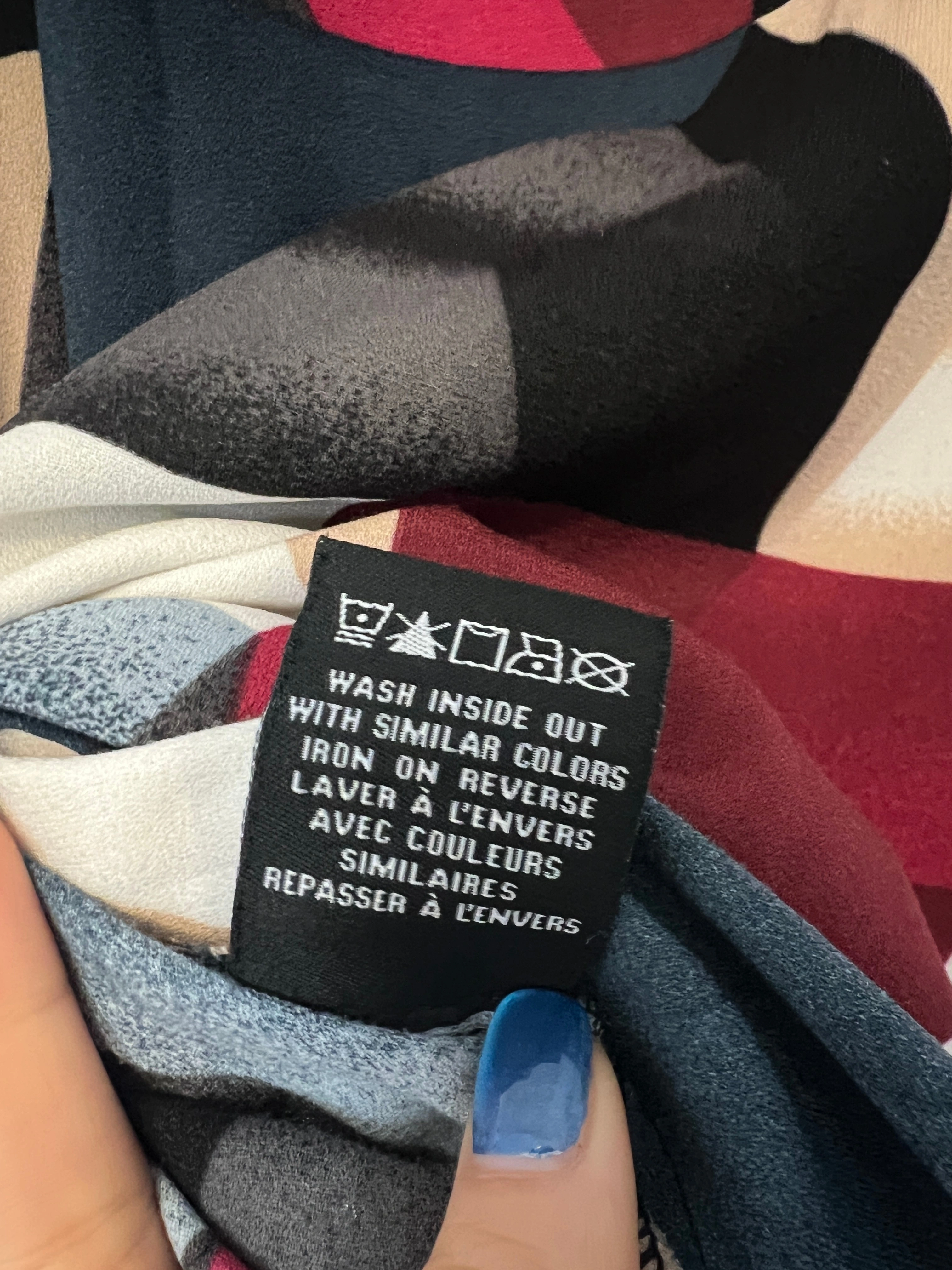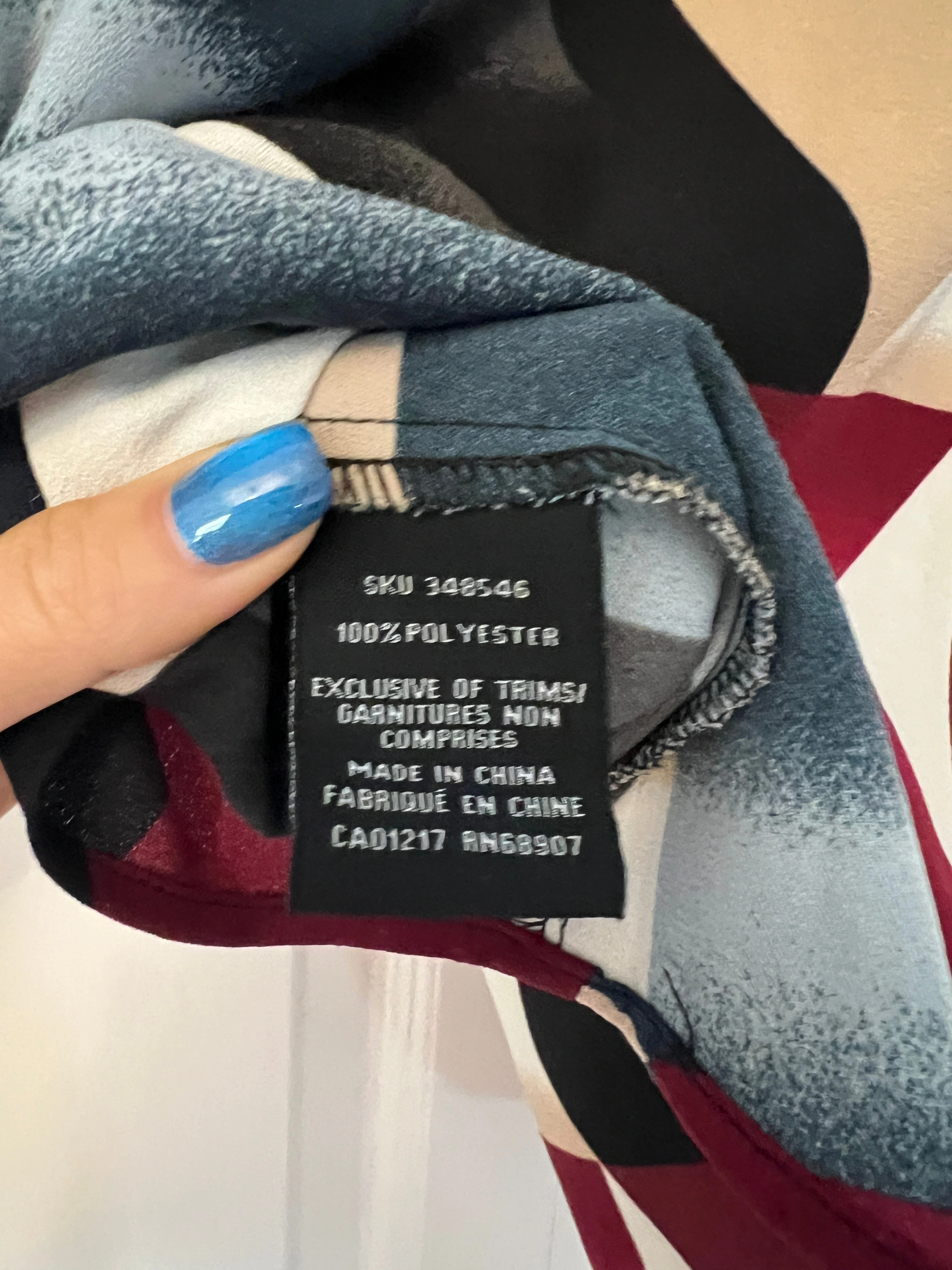 Stylish Le Chateau sleeveless blouse in size XS! The blouse features a unique geometric pattern with red, black, beige, and white colors. Made from 100% polyester, it's lightweight and comfortable. Perfect for the office this spring or summer.