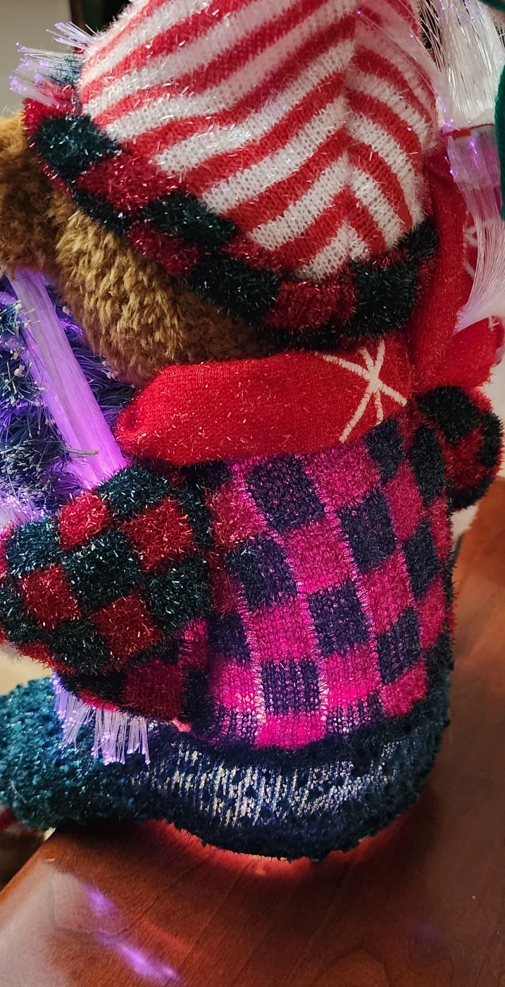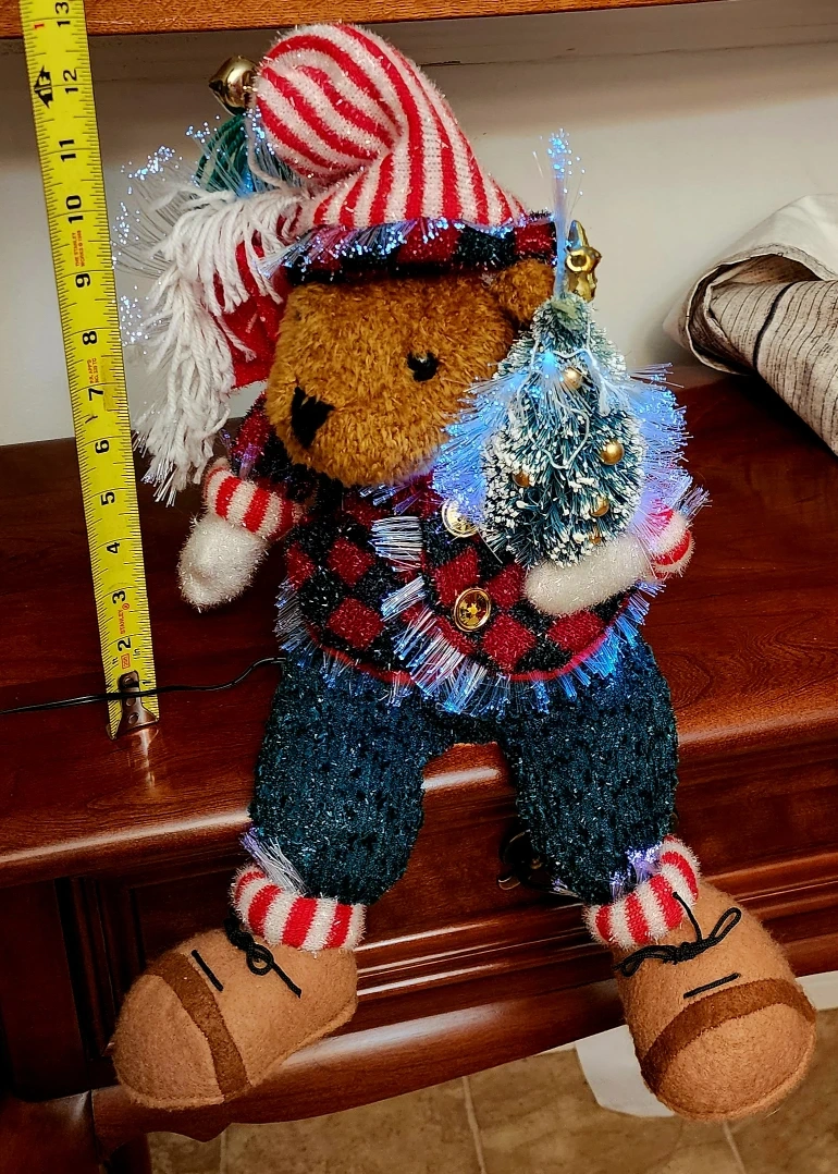 Here is a cute fiber optic Christmas bear! It has a red and white striped hat and a festive outfit. It lights up with different colours, adding a warm glow to any room during the holidays