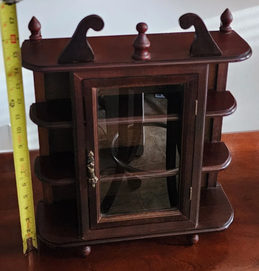 Here's a cute wooden display cabinet! It's got a glass door and shelves on the sides. Perfect for displaying small items or collectibles in your home