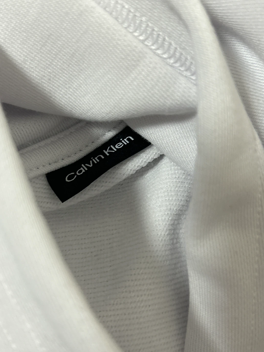 Selling a Calvin Klein white hoodie. It's in great condition and features the Calvin Klein logo on the front and sleeves.