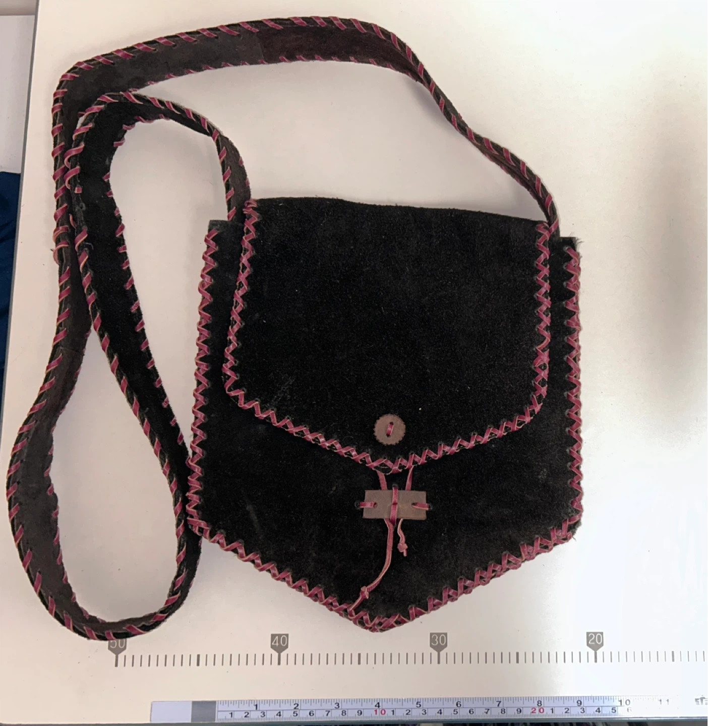 Cute black suede shoulder bag with red stitching. It has a unique handmade look and is perfect for carrying small items. The inside has a zipper pocket for extra security.