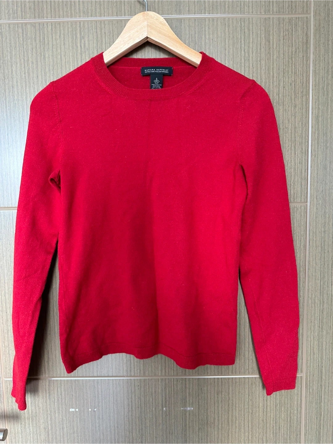 Cozy Banana Republic sweater in a vibrant red color! This is an extra fine merino wool sweater, size small. It's made of 78% merino extra fine wool, 18% rayon, and 3% lycra spandex