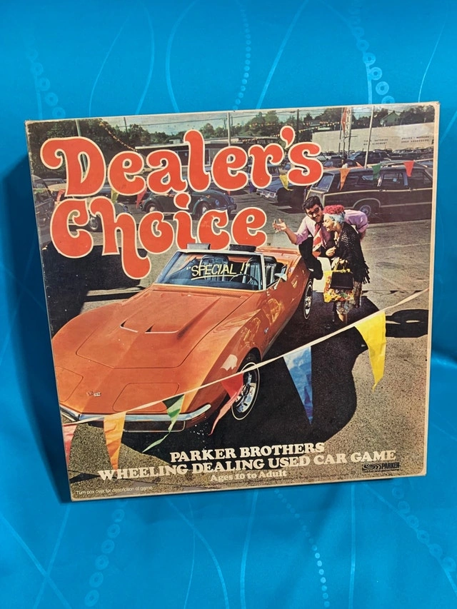 This is a great game from Parker Brothers from 1972 Dealers Choice - wheeling and dealing used car game It looks to be 100% complete (they don’t tell you how much money should be there but it all seems to be there) also includes instructions in both English and French. Also has three promo/hype cards for Parker board games. The vehicles you can choose from range from Harley-Davidson motorcycles to 1912 cars to tanks to corvettes etc The cover of the box is in good condition for its age. It has a nice Corvette on it