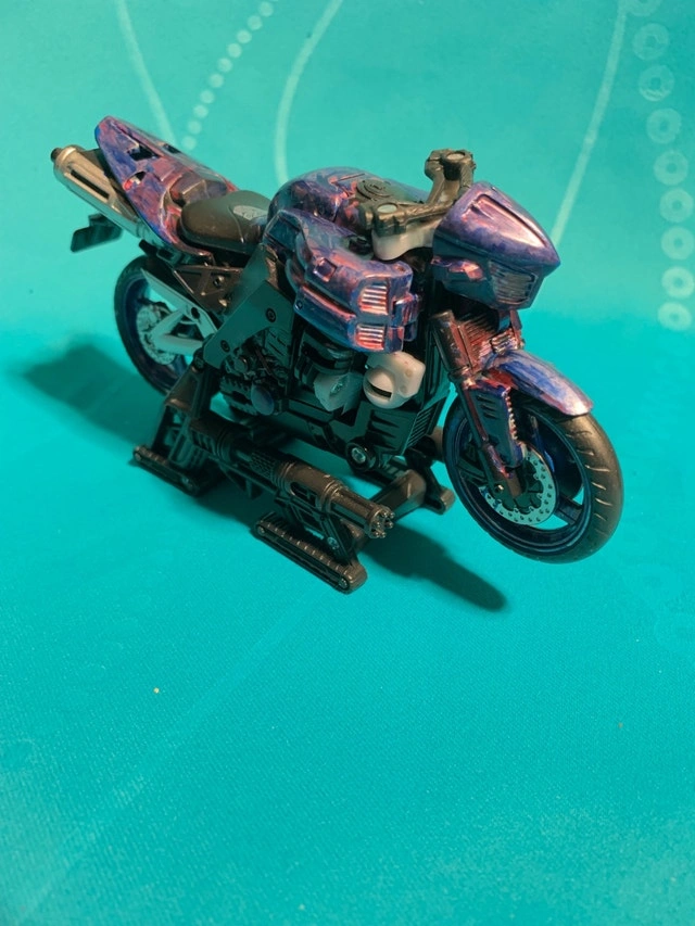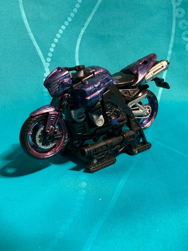 Transformers Revenge of the Fallen Chromia motorcycle character. Includes backer card, instructions and weapon/stand. Also has missile - not shown. Has been painted up with markers by my son but I think it gives it a better look than the original.
