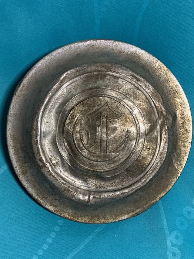 This is a used vintage hubcap that could be used as a decorative object. It has some wear and tear, which adds to its vintage charm. Most likely a vintage Chrysler axle dust cap or grease cover. It features a prominent "C" logo and appears to be made of aluminum, showing signs of age, dents, and scratches. This part is an original antique automobile accessory from the 1920s or 1930s.