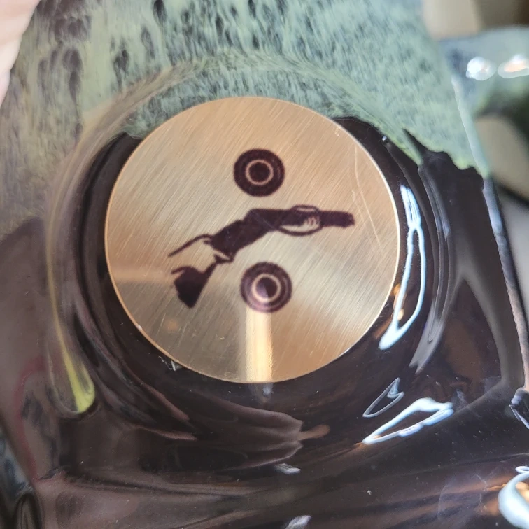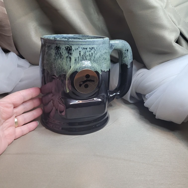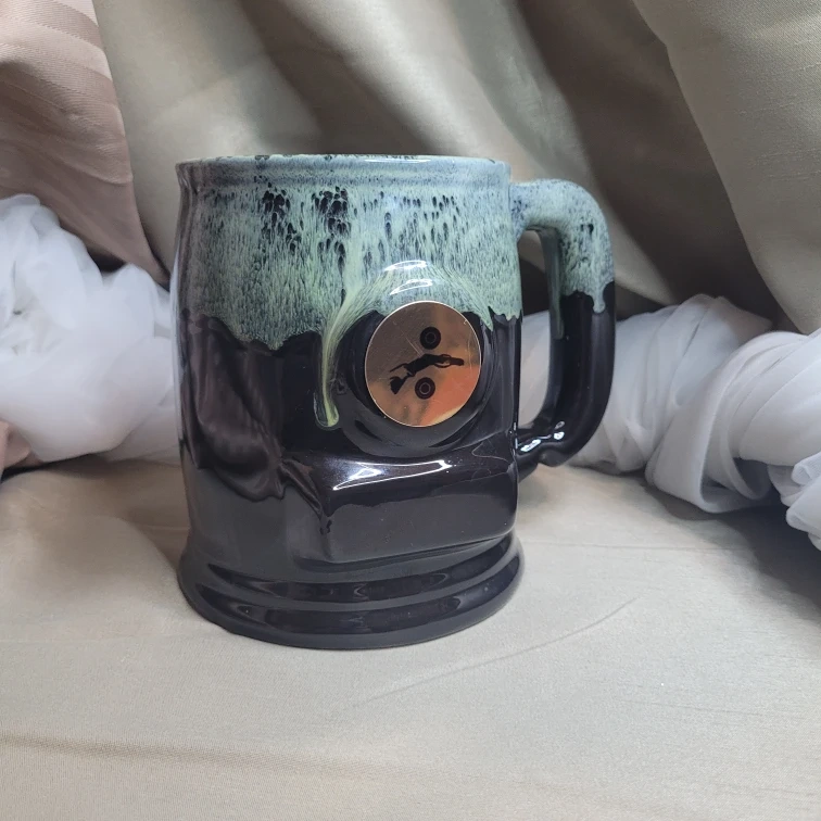 Unique Vintage Canadian Pottery Drip Glaze OverSized Mug with Metal Decor on the Front 6 1/4" tall x 4 1/2" Round then the Handle Excellent Condition please see all pictures Tiny Glaze chip on Bottom in the Word Canada