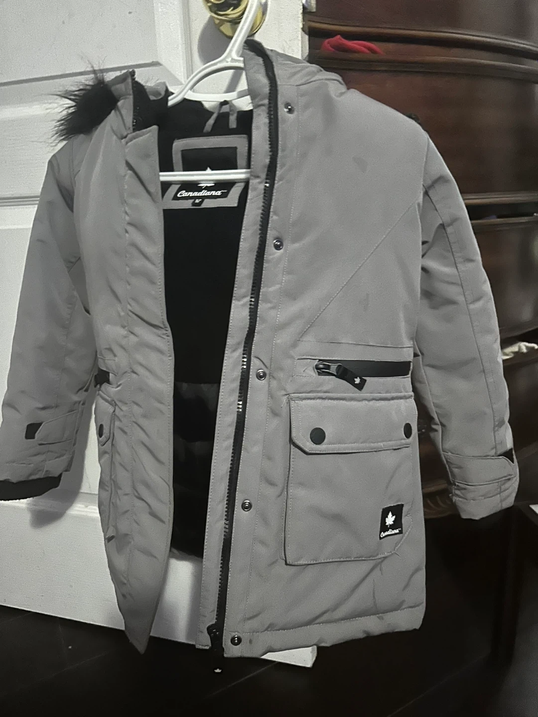 Selling a Canadiana winter jacket in a nice grey colour. It's for kids age 6-8years, looks to be in good condition. Perfect for the cold weather!