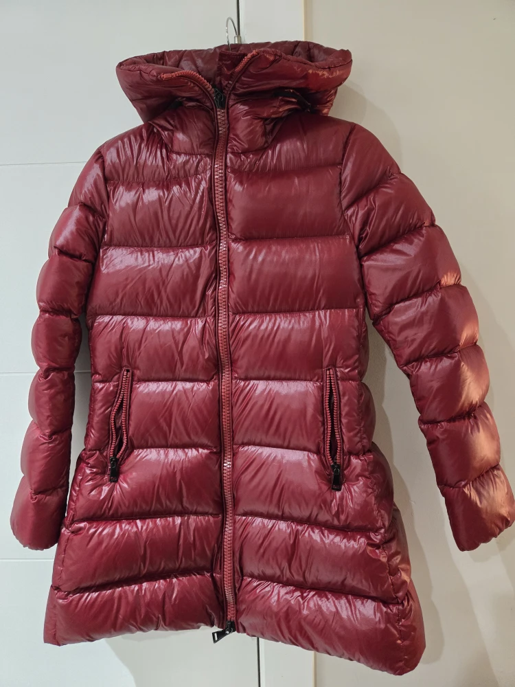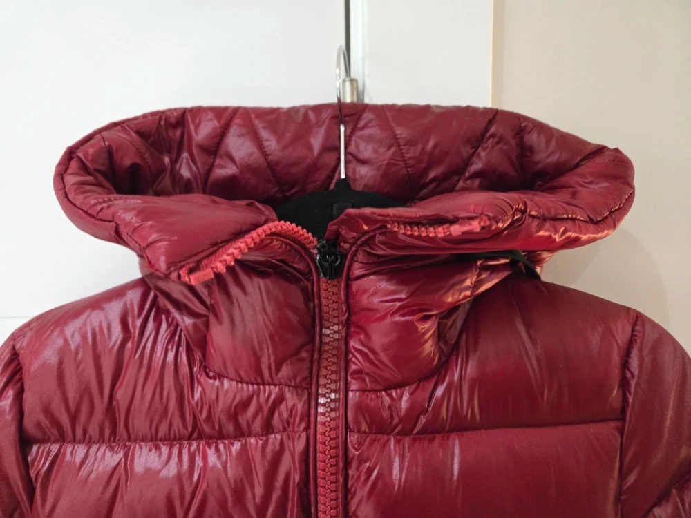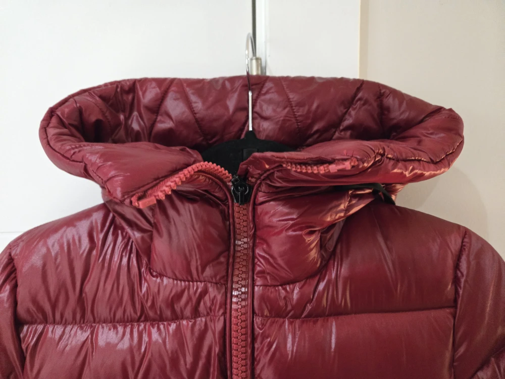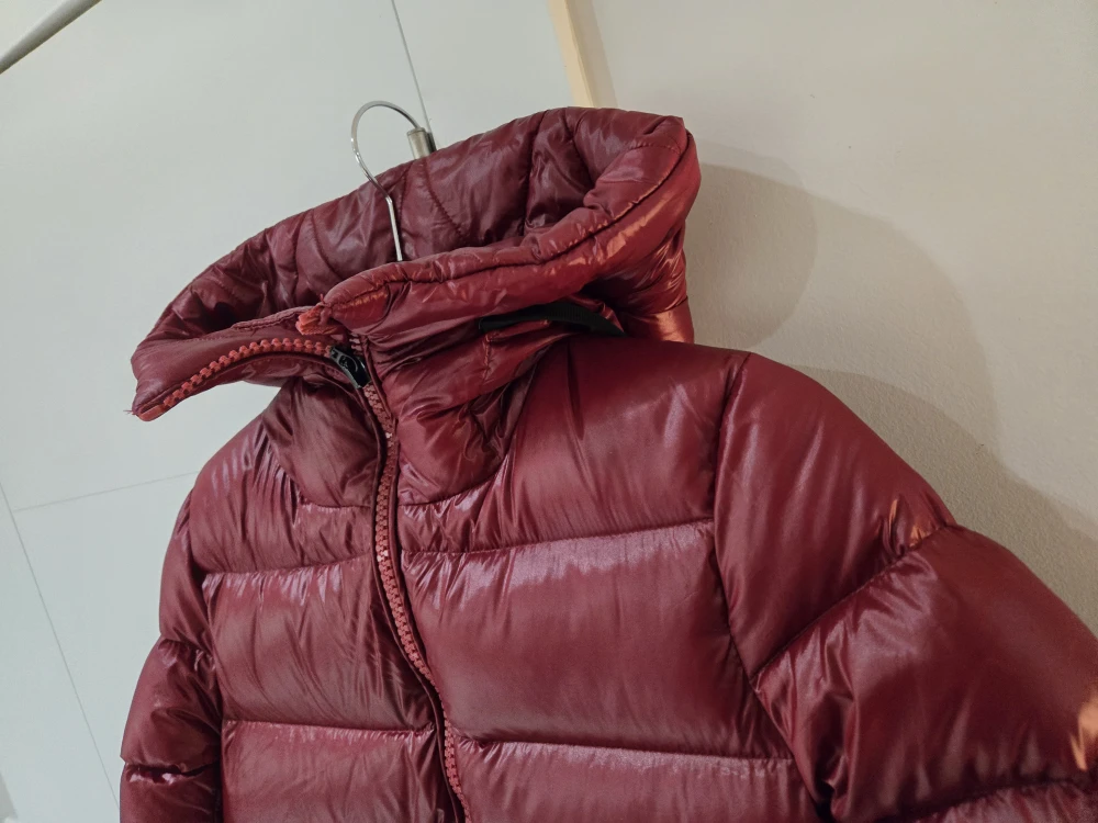 Here's a stylish burgundy puffer jacket that's perfect for staying warm and looking great during the colder months! It features a cozy hood and a sleek design